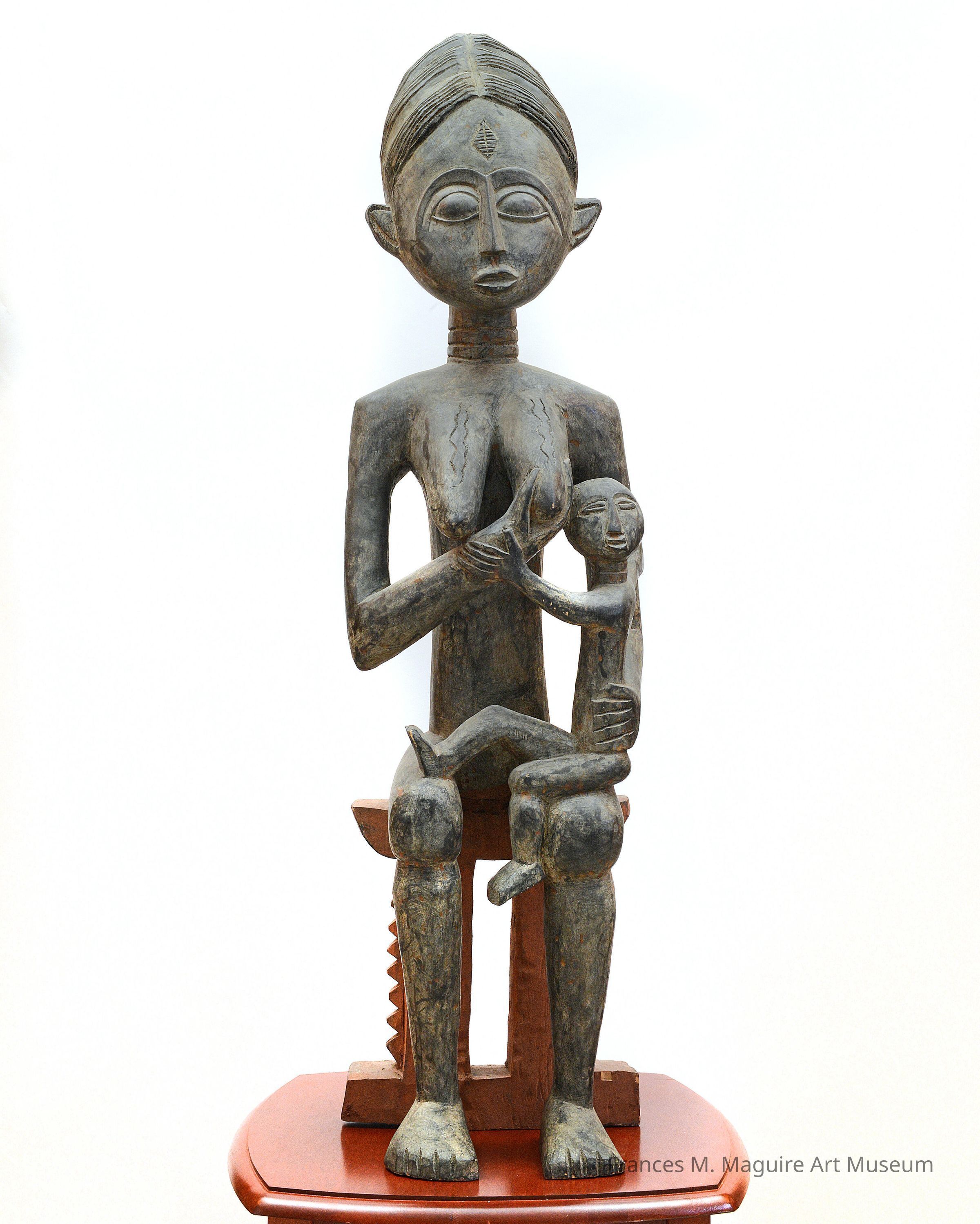 This free-standing wooden sculpture of a mother and child was created by the Asante people of the Akan World. Such mother and child sculptures can be made in all different styles, but this specific one is thin limbed and the mother has a longer torso compared to many others. The mother also represents a queen mother. Her elite status can be recognized by both its larger size and the elaborate headpiece. In the Asante culture, mother and child sculptures represented family, maternity, and most importantly lineage. Lineage in Asante culture descends from the mother’s ancestry. The portrayal of breastfeeding of a queen mother and child emphasizes the importance of the succession of family, especially of a royal family. These sculptures were typically placed on the shrines of royals, as well as commoners.Label Type