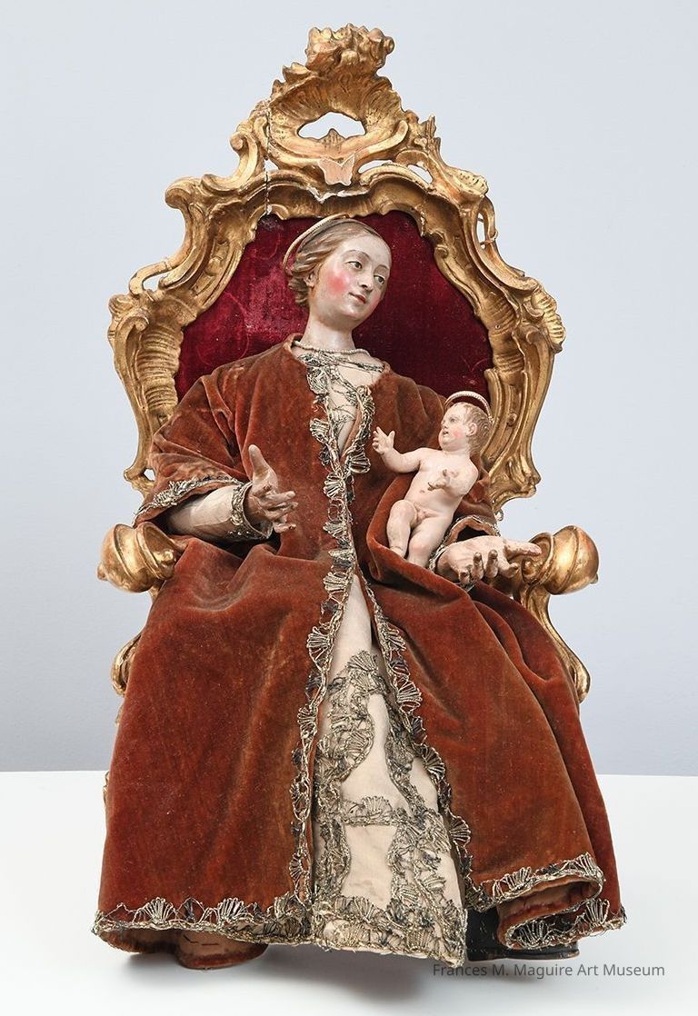 18th- or 19th-c. Neapolitan sculpture of the Madonna and Christ Child. The two figures are dressed and seated in a gilded and upholstered baroque chair.