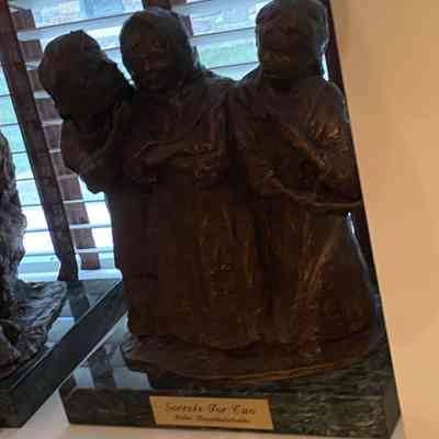 Late-20th-c. bronze sculpture of two figures sharing secrets while a third figure is left out.Made/Created