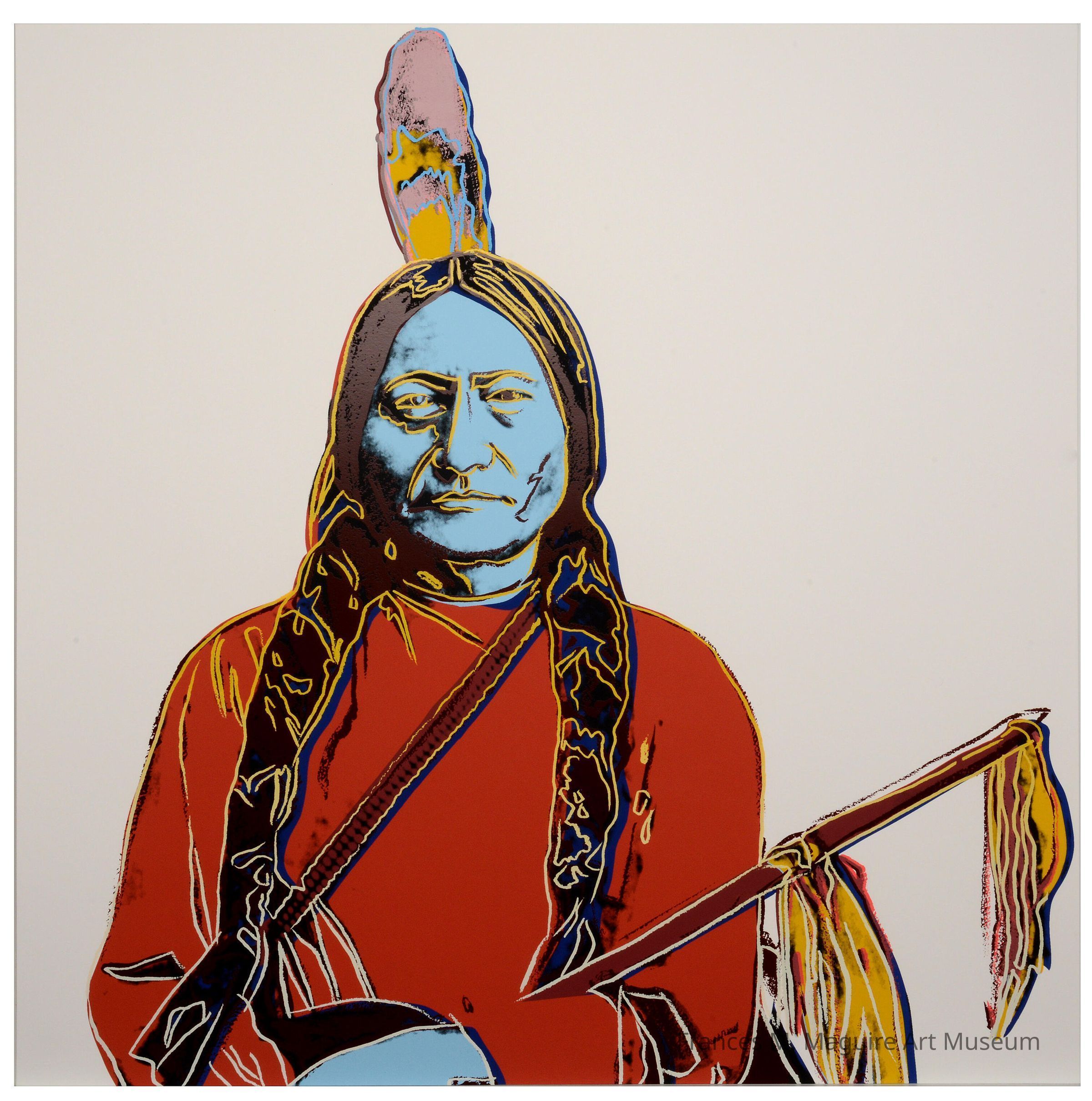 Andy Warhol fue una figura destacada del arte pop, movimiento que consistía en retar lo abstracto y cuestionar y celebrar la cultura de consumo del siglo XX. Toro Sentado, líder de la tribu Hunkpapa Lakota, es conocido por su deseo de unificar y defender a las comunidades indígenas de los Estados Unidos durante el siglo XIX. Warhol se sirvió de una fotografía de archivo para crear este retrato que originalmente debía haber formado parte de Cowboys and Indians (Vaqueros e indios), una serie de grabados sobre el mito de la heroicidad del Oeste americano. El recurso de la serigrafia (técnica de impresión comercial) y la lisura y luminosidad de los colores son sellos de identidad en la obra de Warhol.Made/Created