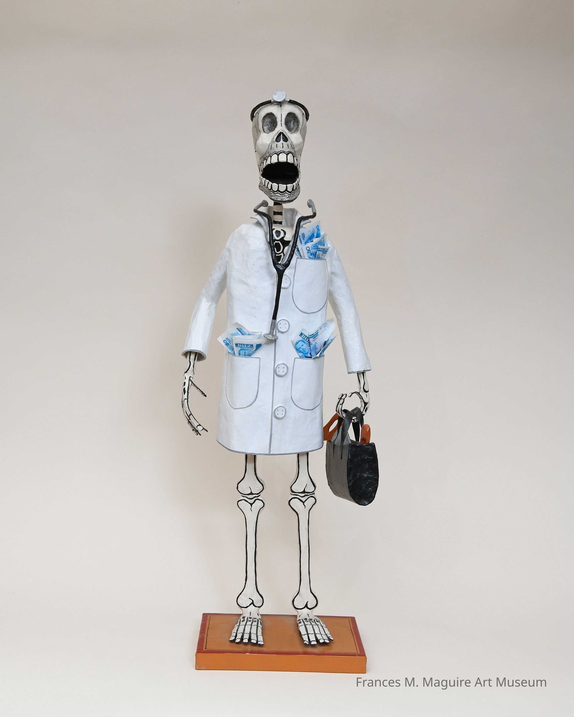 20th-c. Mexican mixed media papier-mâché sculpture of a skeleton dressed as a doctor.Artwork Details