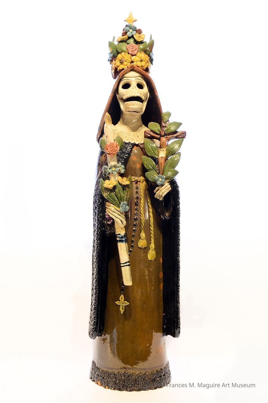 20th-c. Mexican folk art sculpture of a skeleton nun wearing a habit and floral headdress and holding a processional candle and crucifix.Artwork Details