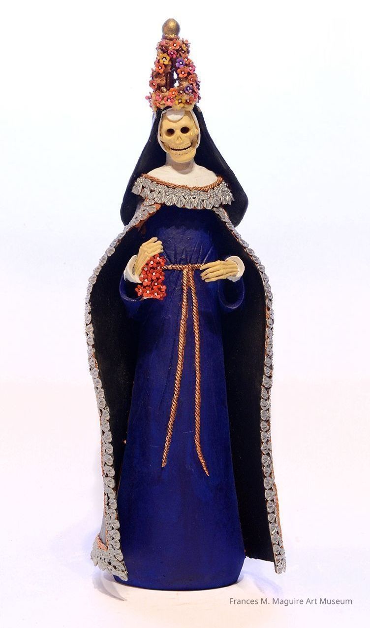 20th-c. Mexican folk art sculpture of a skeleton nun wearing a black habit and floral headdress.Artwork Details