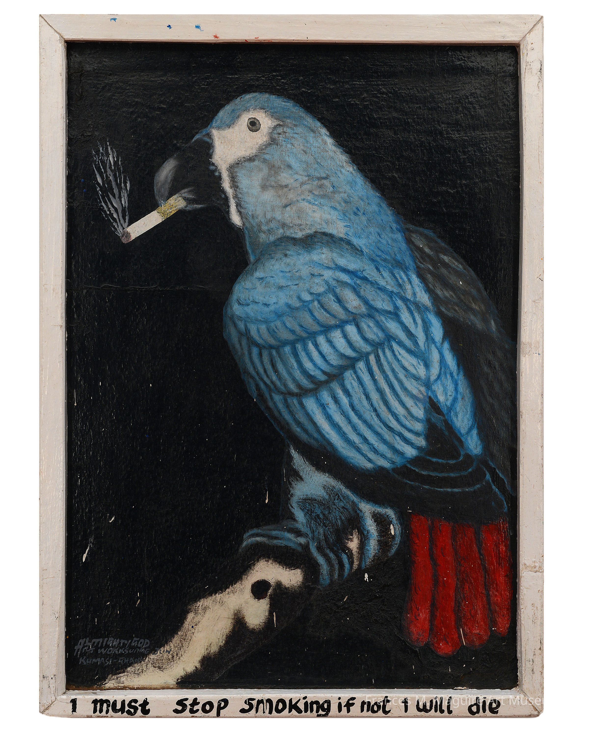 Ghanaian mixed medium on board work of a parrot smoking, accompanied by the text "I must stop smoking if not I will die."Made/Created