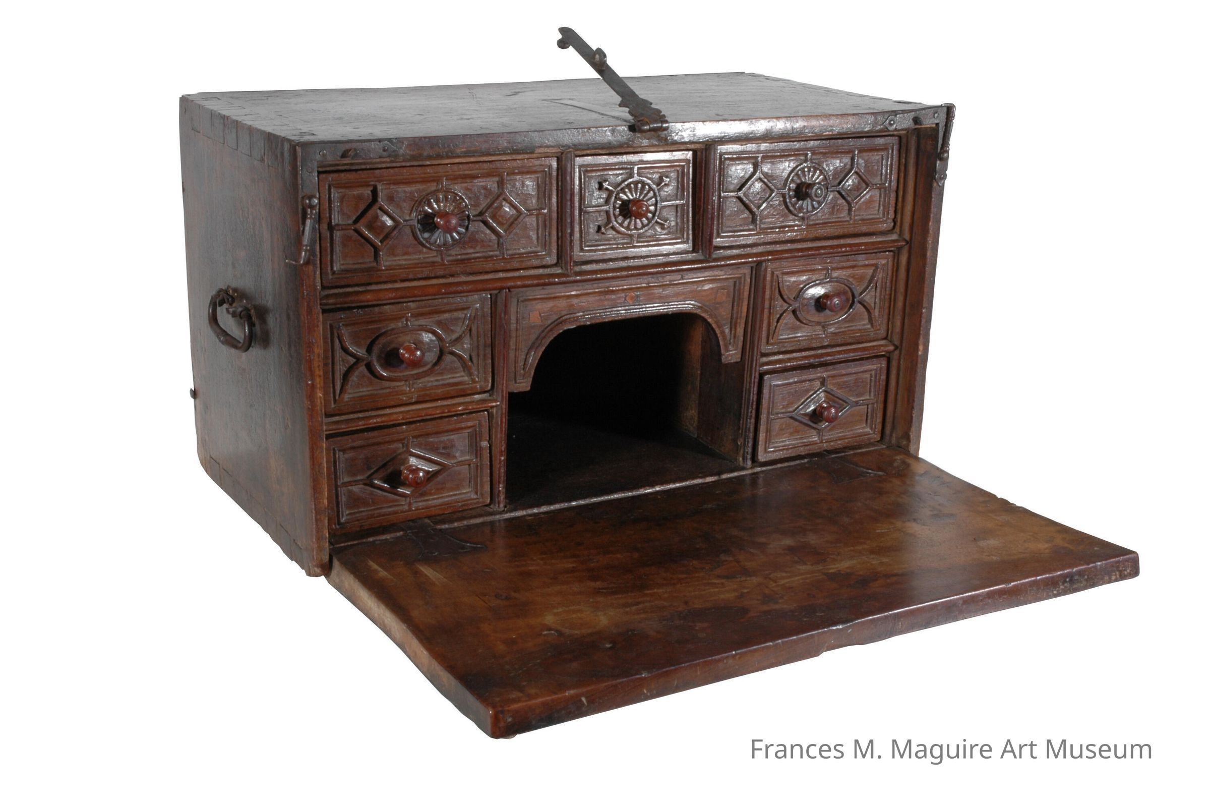 18th-c. Spanish Colonial escritorio or traveler’s desk and document box. Made of walnut wood and affixed with iron fittings, the escritorio has an open space in the center and seven drawers around the opening.