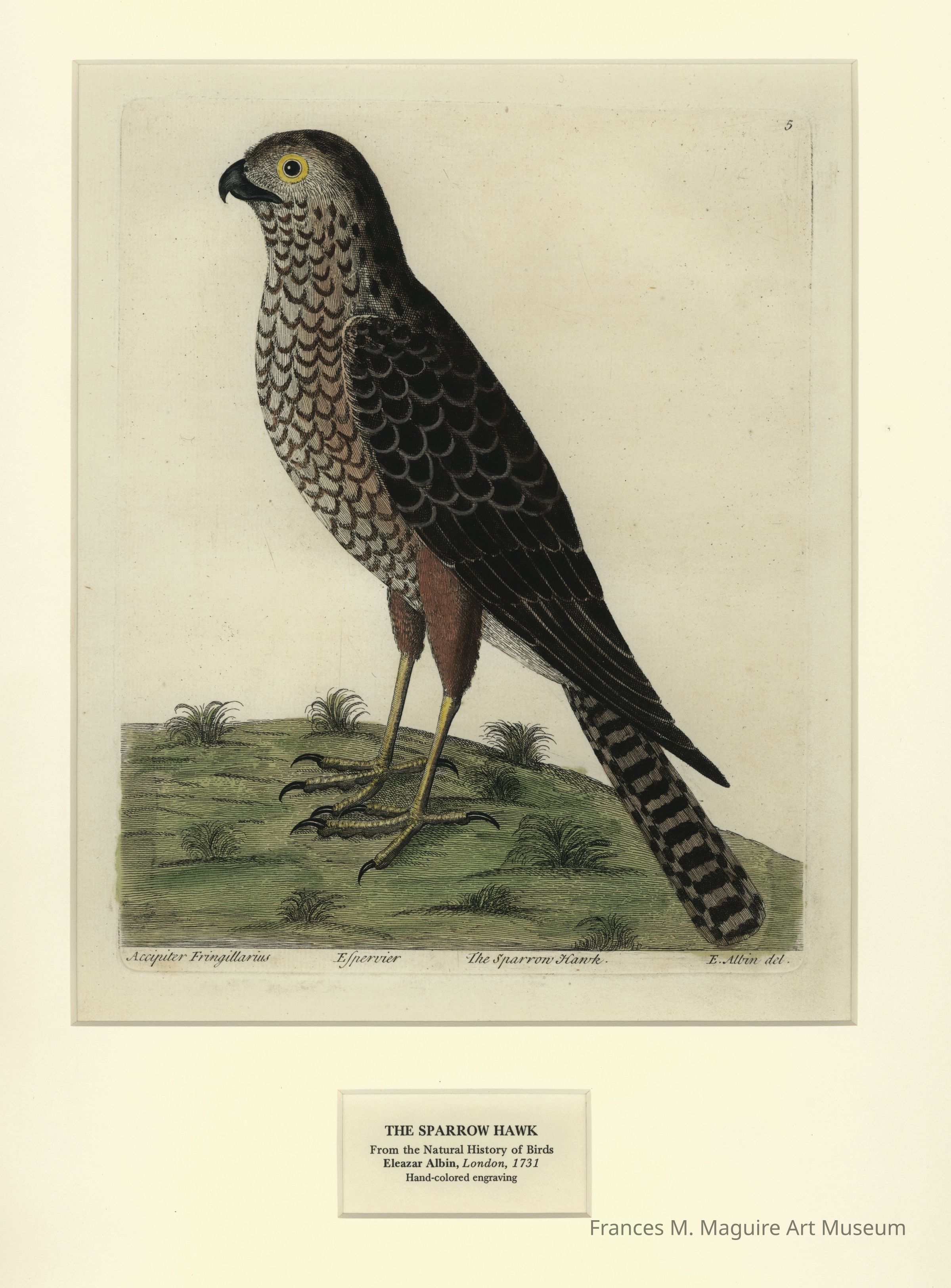 18th-c. hand-colored lithograph of a sparrow hawk published in the book, The Natural History of Birds.Made/Created