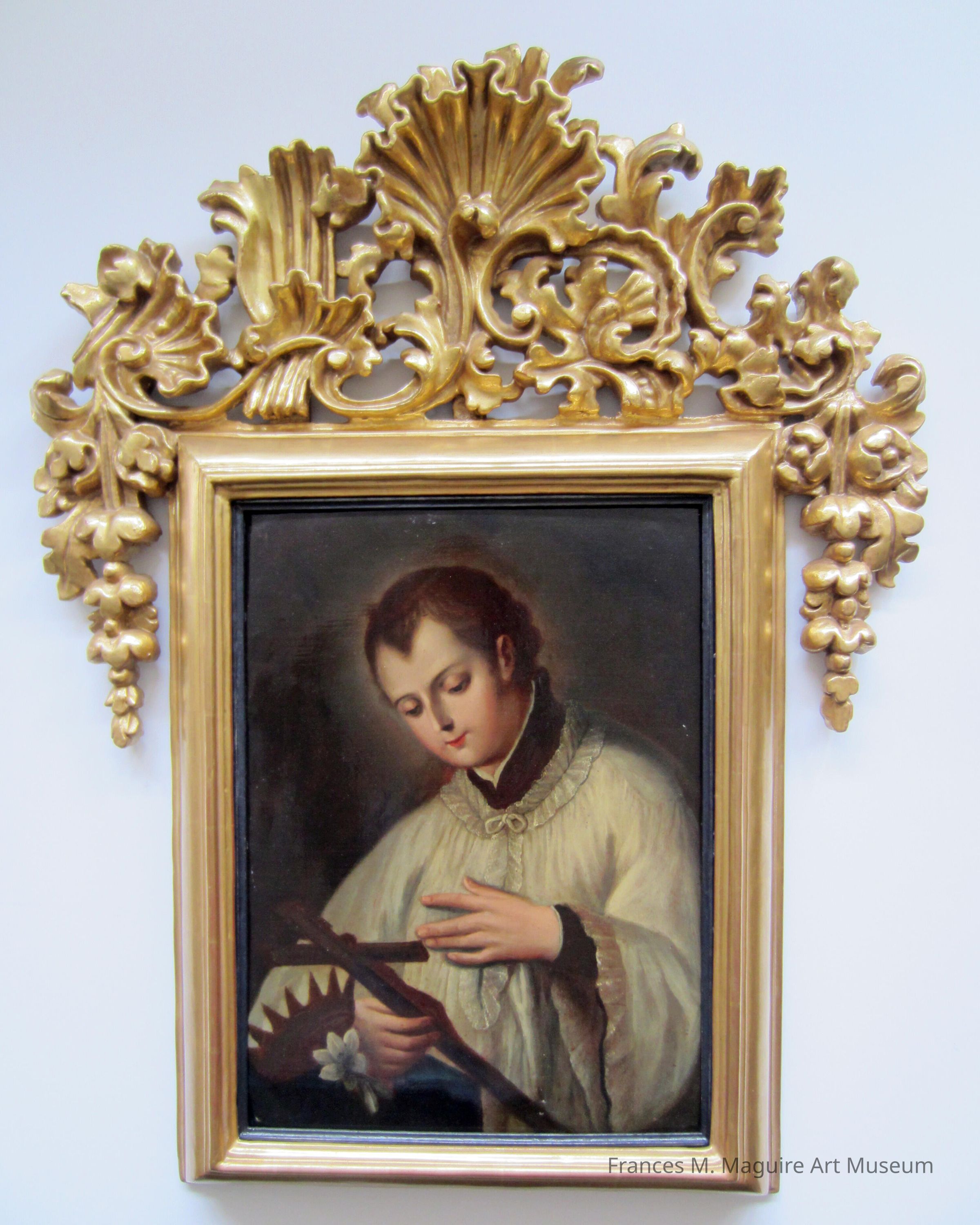 San Luis Gonzaga es el santo patrón de los estudiantes y por ello una acertadísima obra para formar parte de la colección de St. Joseph University. Luis Gonzaga fue un aristócrata italiano del siglo XVI que a temprana edad rechaza su riqueza y se incorpora a la Sociedad de Jesús. El santo aparece representado como un joven vestido con el hábito blanco del noviciado de los Jesuitas y adorando un crucifijo, símbolos de su devoción y sacrificio. Otros atributos incluyen la azucena, referente de castidad; y la coronilla dejada a un lado, símbolo de su rechazo a la vida entre nobles.