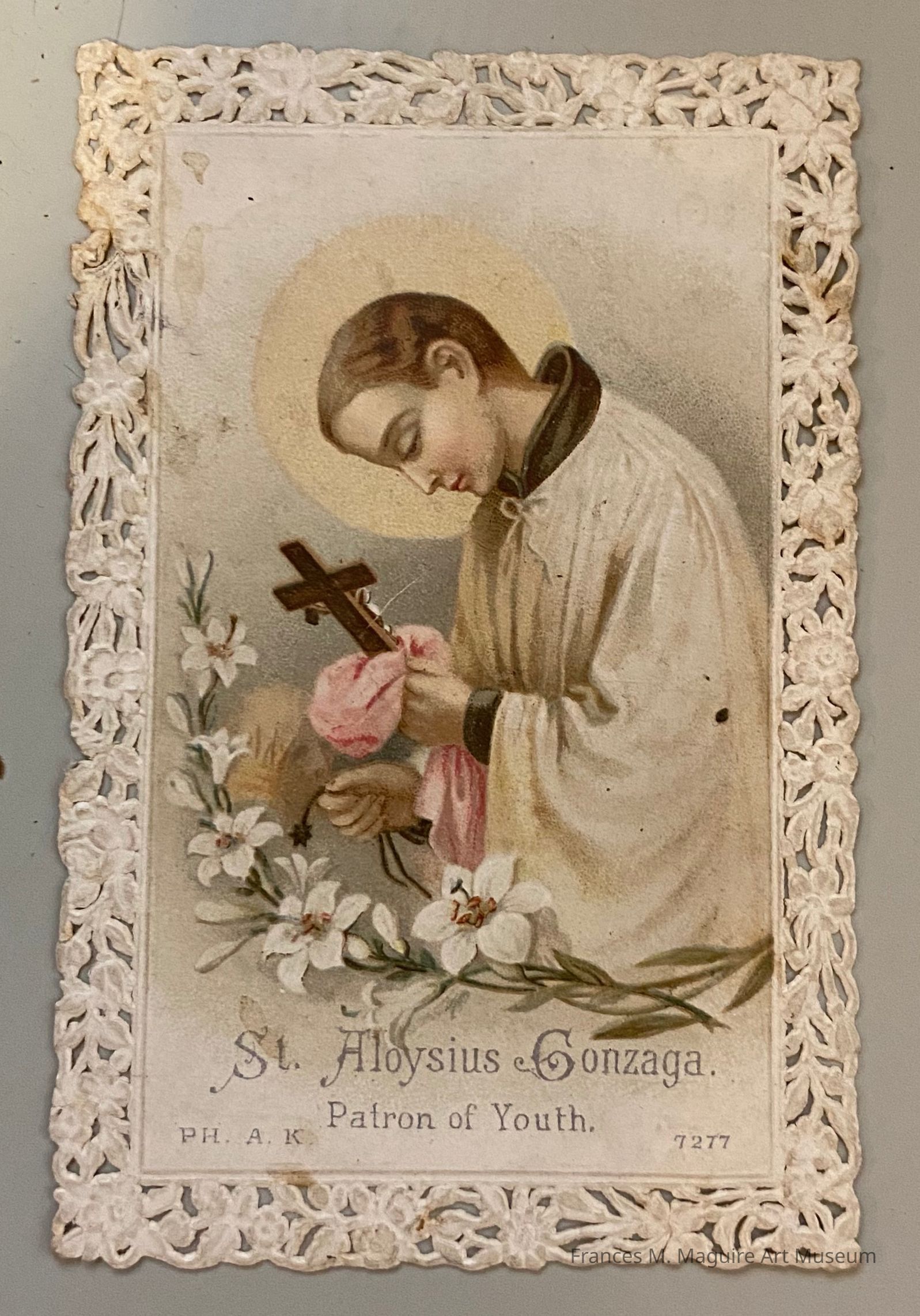 American holy card with a print of St. Aloysius Gonzaga. The card has paper lace edges.