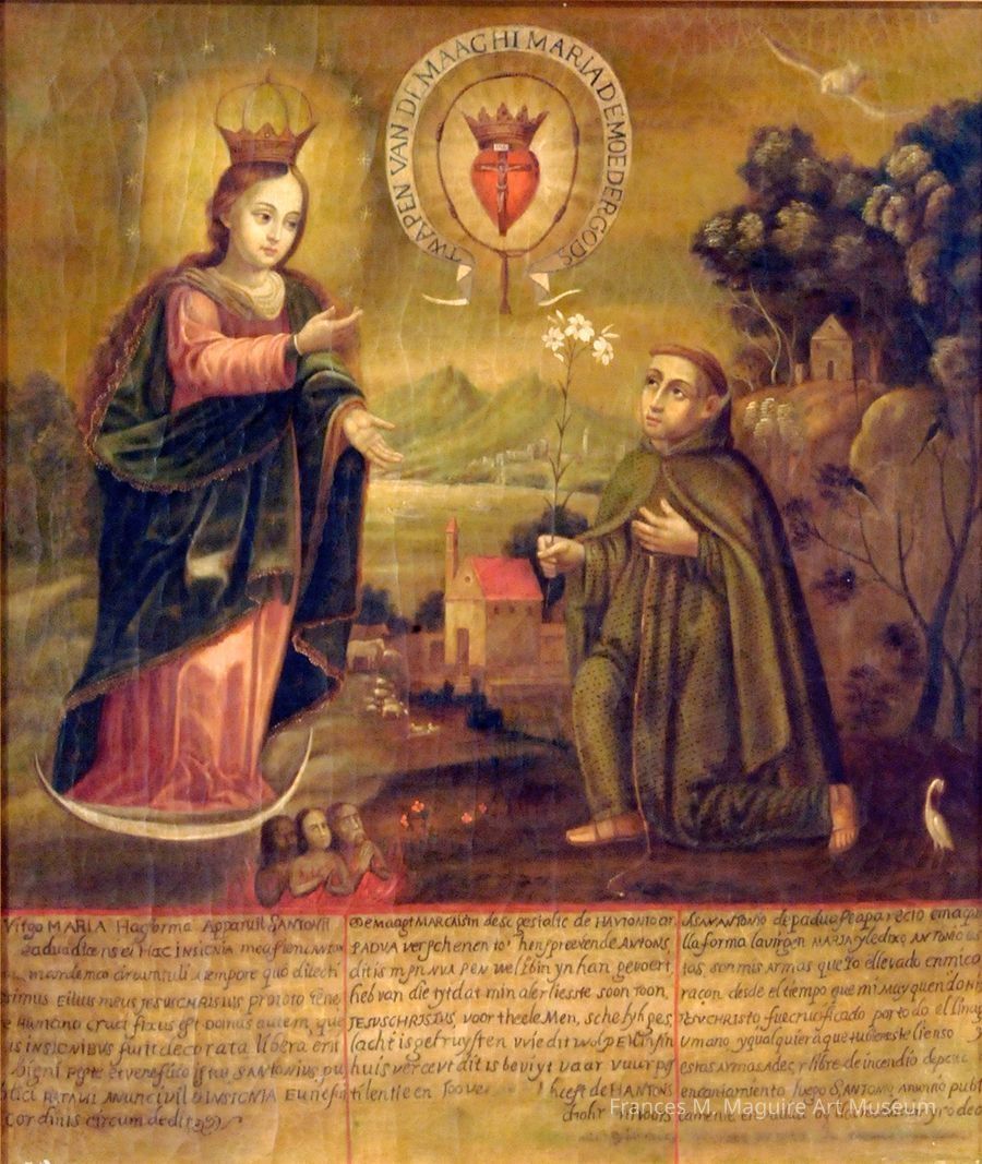 20th-c. reproduction of a painting of St. Anthony of Padua and the Virgin Mary. This work is a combination of painting and game board (of unknown rules) and features texts in Latin, Spanish, and Dutch, respectively.Made/Created