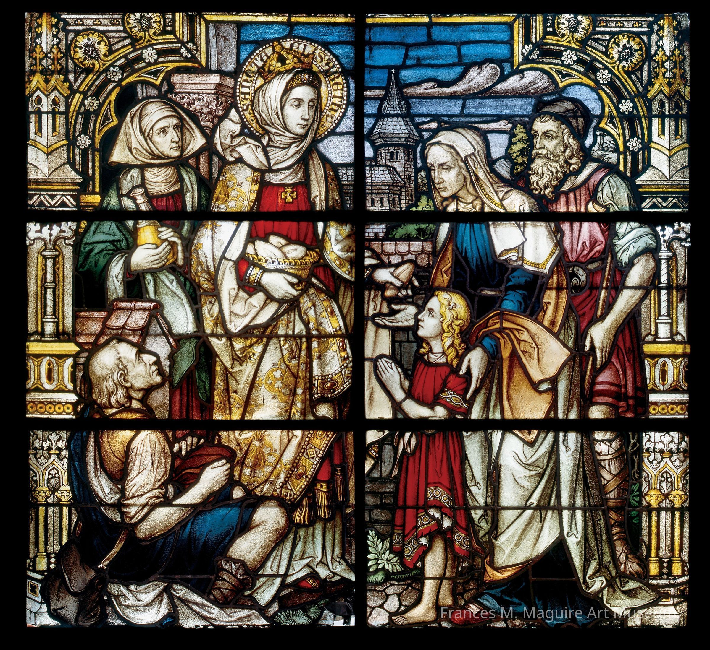 Early-20th-c. German stained glass window comprised of two lancets with tracery. The window depicts St. Elizabeth of Hungary giving food to a poor family.Made/Created
