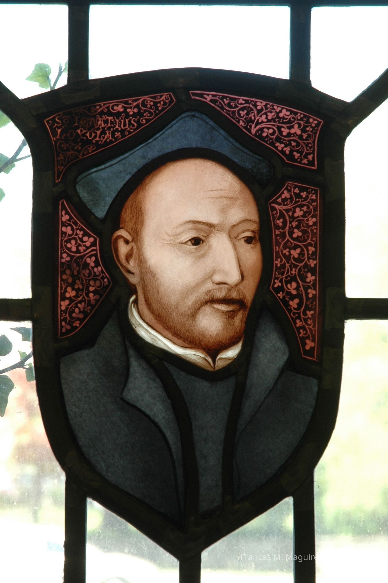 Late-20th-c. stained glass shield of St. Ignatius Loyola. Accompanying the shield is a list of members of the 1851 Society, who commissioned this piece.Made/Created