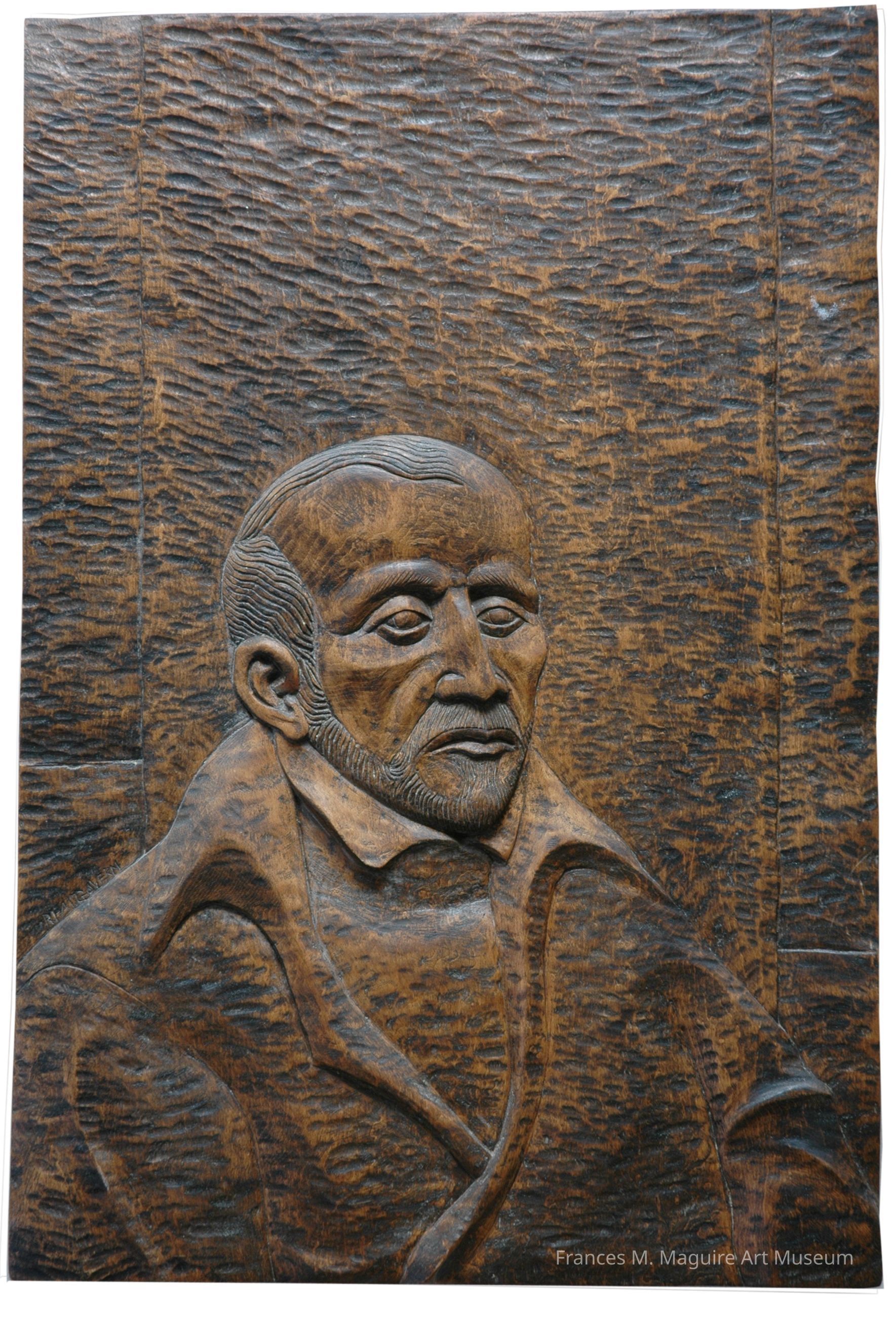 20th-c. carved wood plaque of St. Ignatius of Loyola. President Terrence Toland commissioned this work in memory of his close friend, Rev. William F. Troy, S.J. (1920-1967).Made/Created