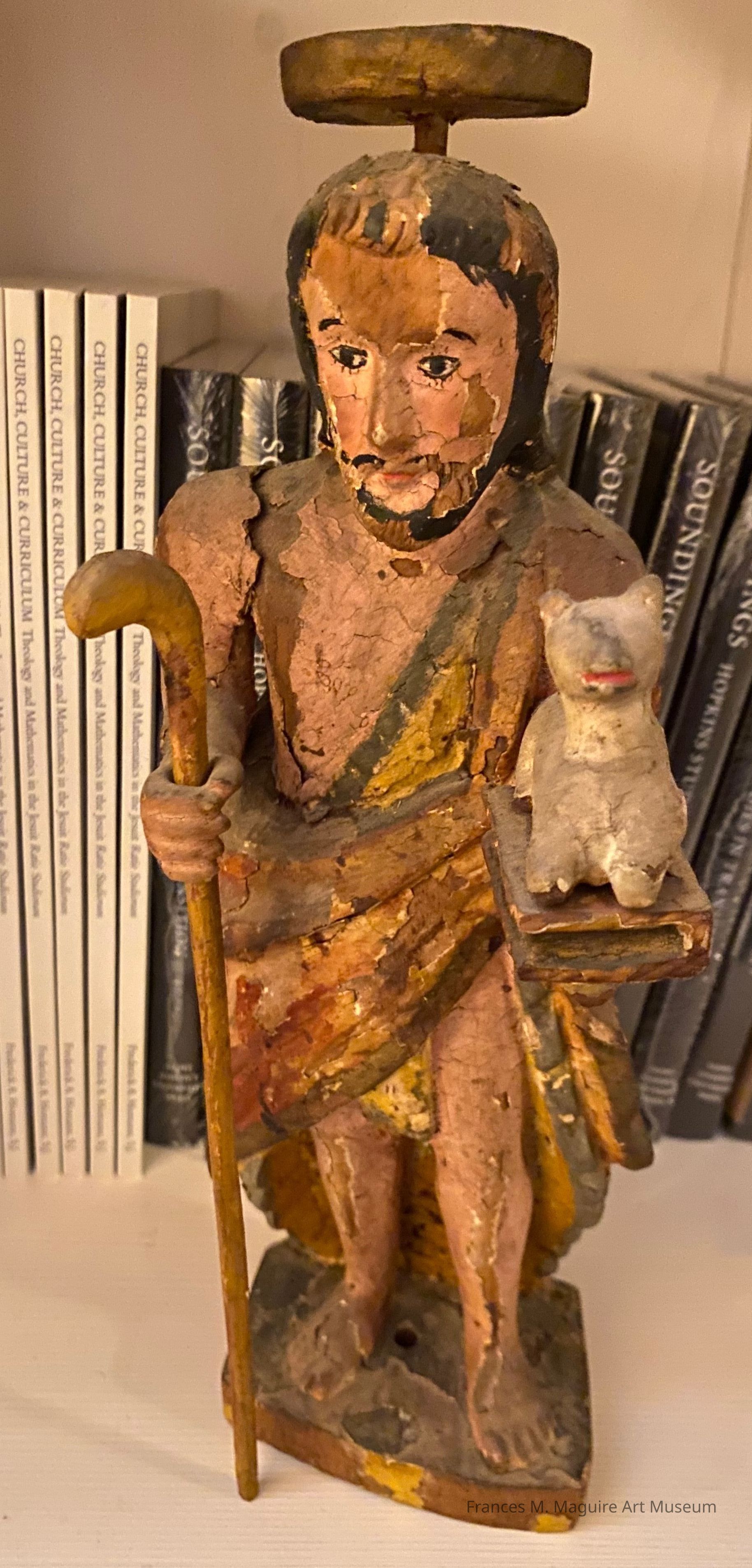Wood bulto of John the Baptist holding a staff and a lamb.