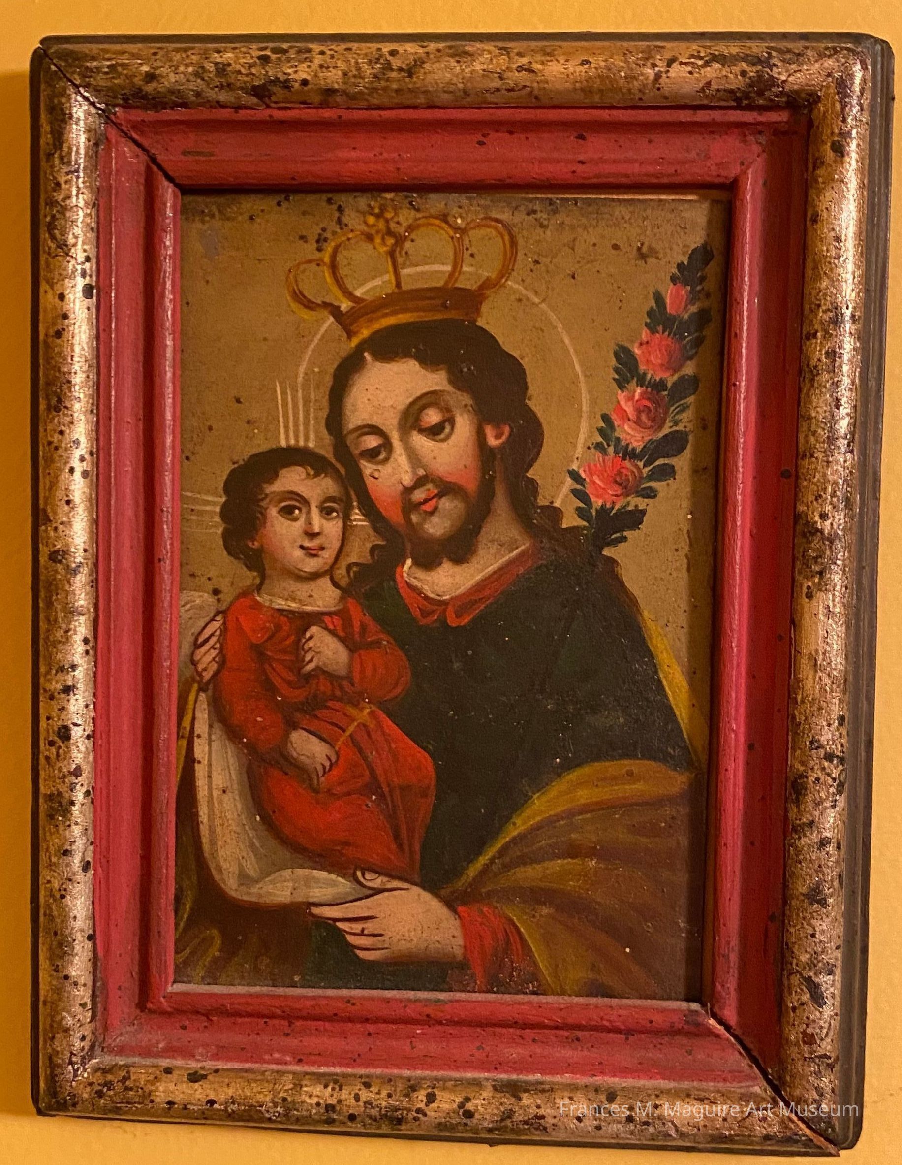 19th-c. Mexican retablo painting of St. Joseph holding the Christ Child.Dimensions