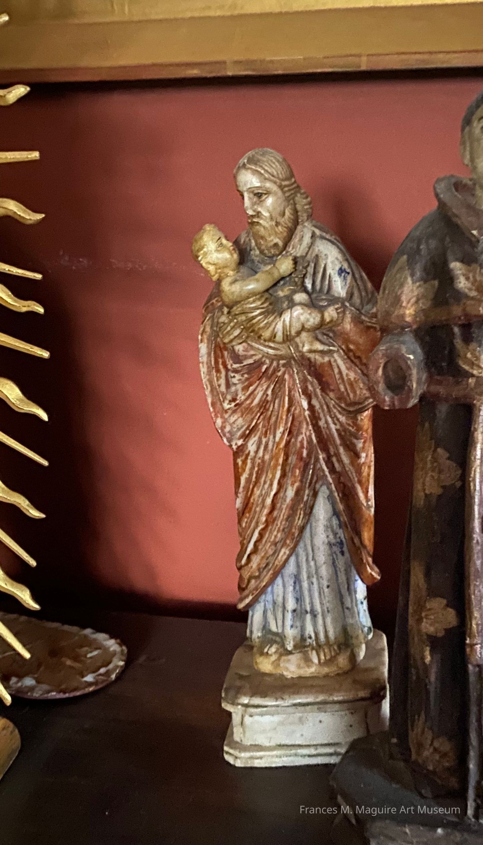 Polychromed huamanga stone sculpture of St. Joseph holding the Christ Child.Artwork Details