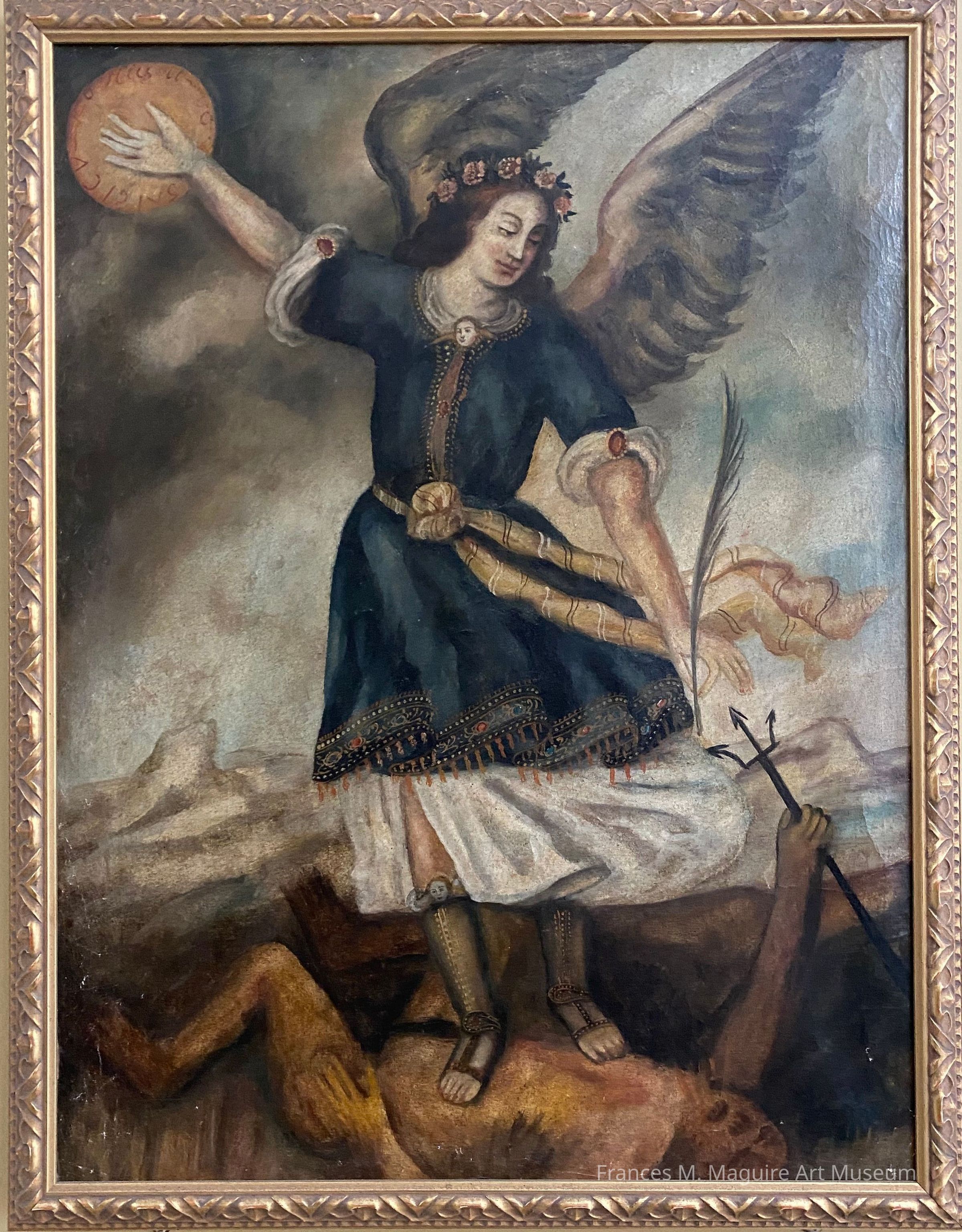 20th-c reproductions of a Colonial Peruvian painting depicting St. Michael the Archangel standing in triumph over Satan.Made/Created