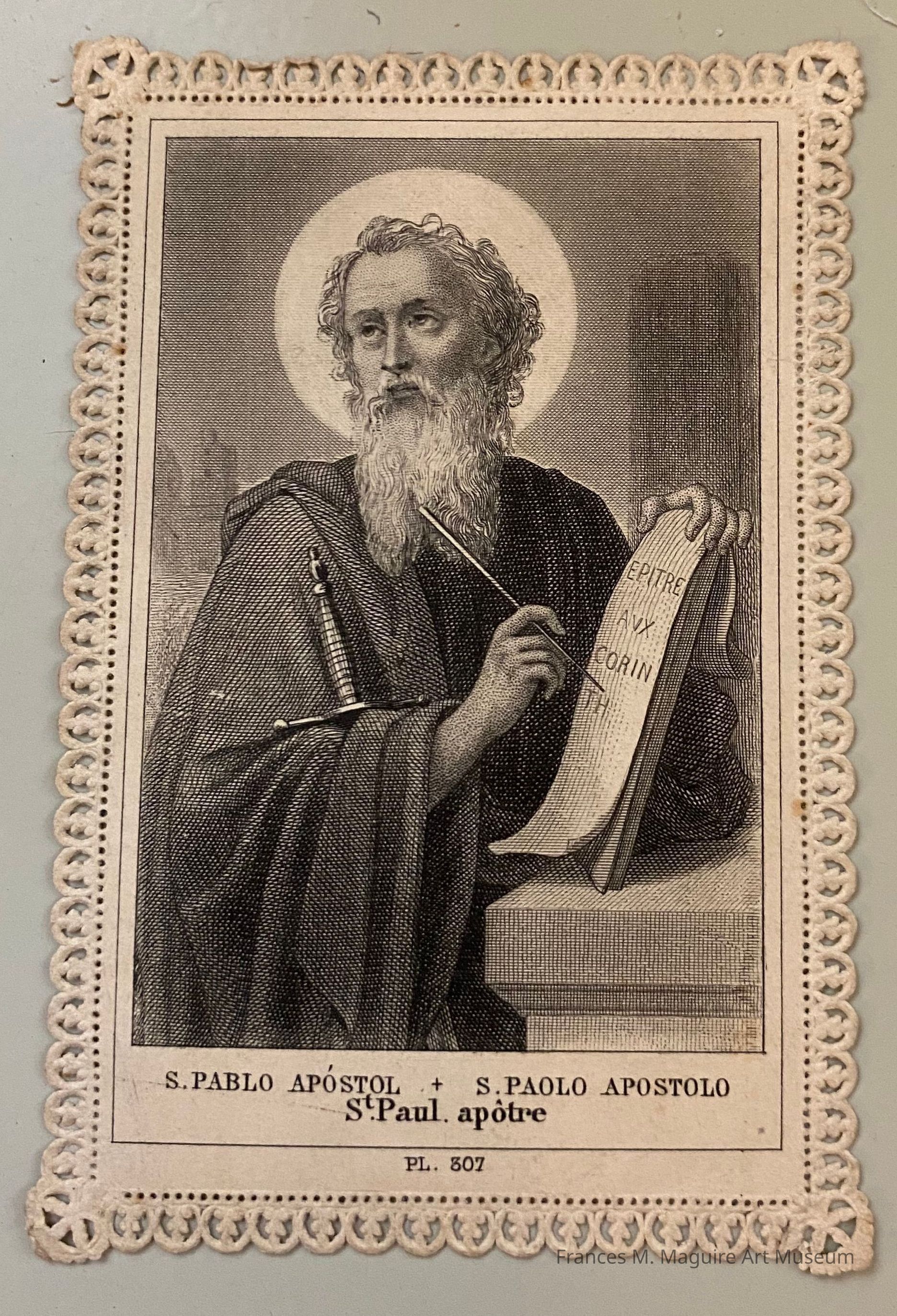 French holy card with a print of St. Paul the Apostle. The card has paper lace edges.