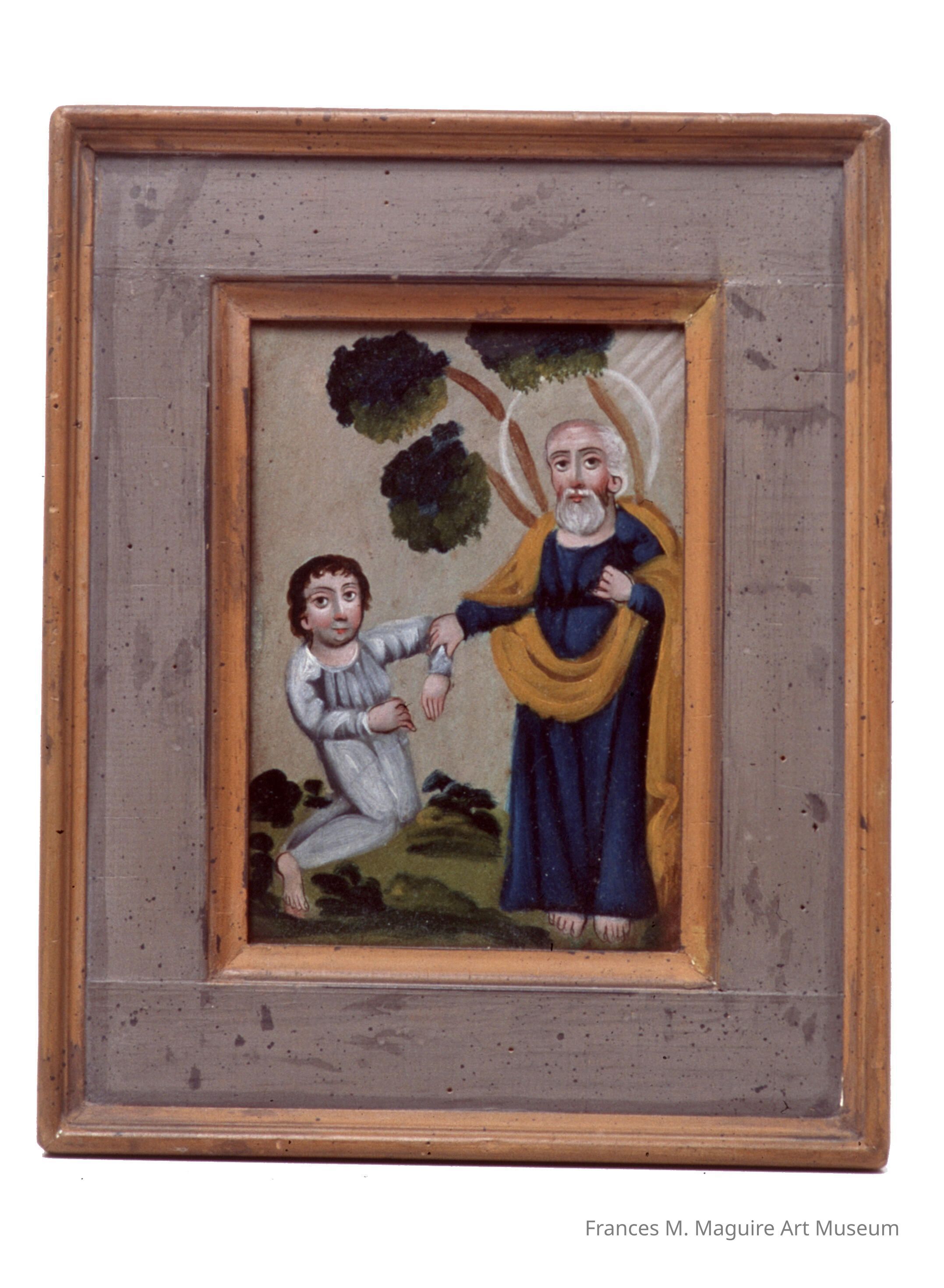 Retablo of St. Peter and figure of a Boy in gray and gold painted wood frame.
