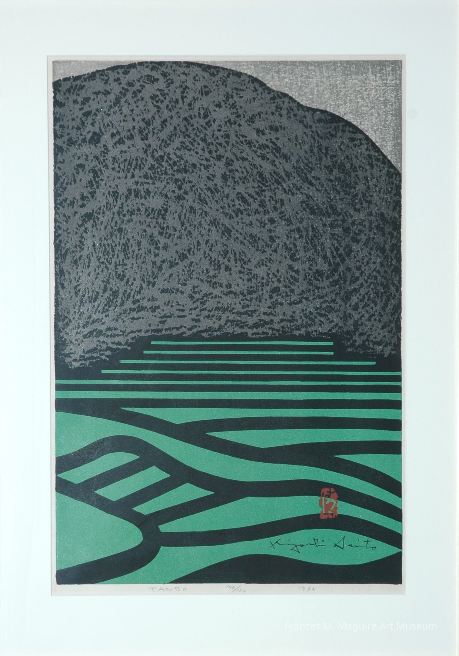 This work depicts a rice paddy field, or tanbo, capturing Japan's renowned agricultural landscape with an abstract approach. The piece showcases Saitō’s mature style, blending a modern vibrancy with traditional Japanese themes of imperfect and textured spaces. This style originates from the post-war sōsaku-hanga (creative print) movement, where artists aimed to infuse personal expression into their works, and typically completed each step of the printmaking process themselves. Here, a restrained color palette, mainly composed of earthy tones, complements the field’s richness and hints at the calmness of rural life. The contrast of absence and presence establishes a visual rhythm, inviting you to reflect on the harmony between Japan's natural and cultural aesthetics.Label Type