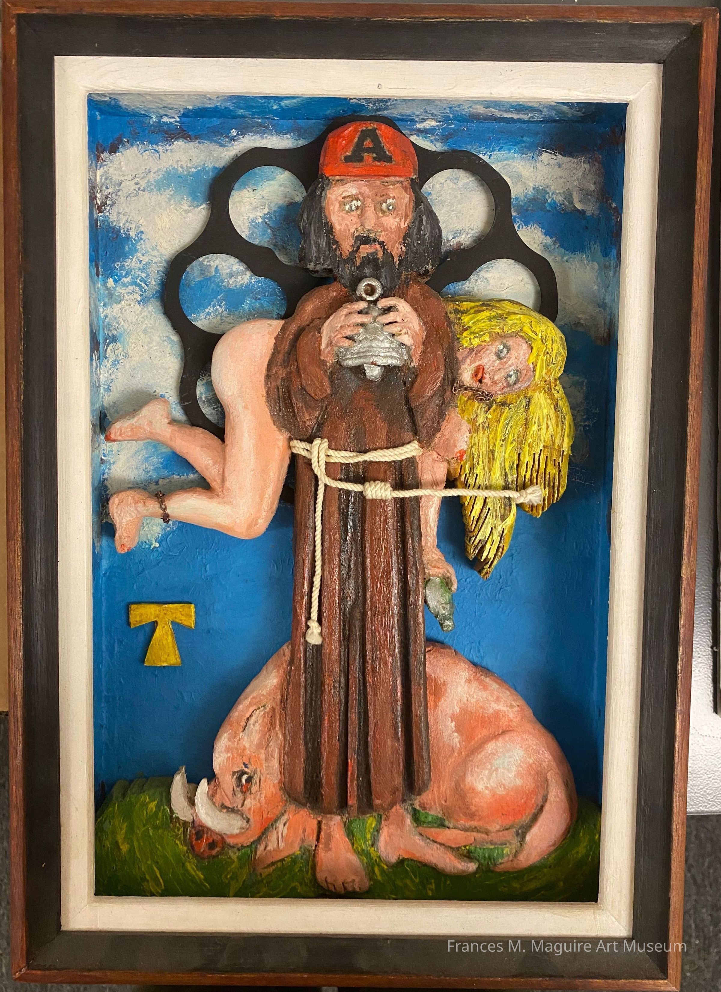 20th-c. mixed media box construction of St.Anthony, a woman, and a warthog.