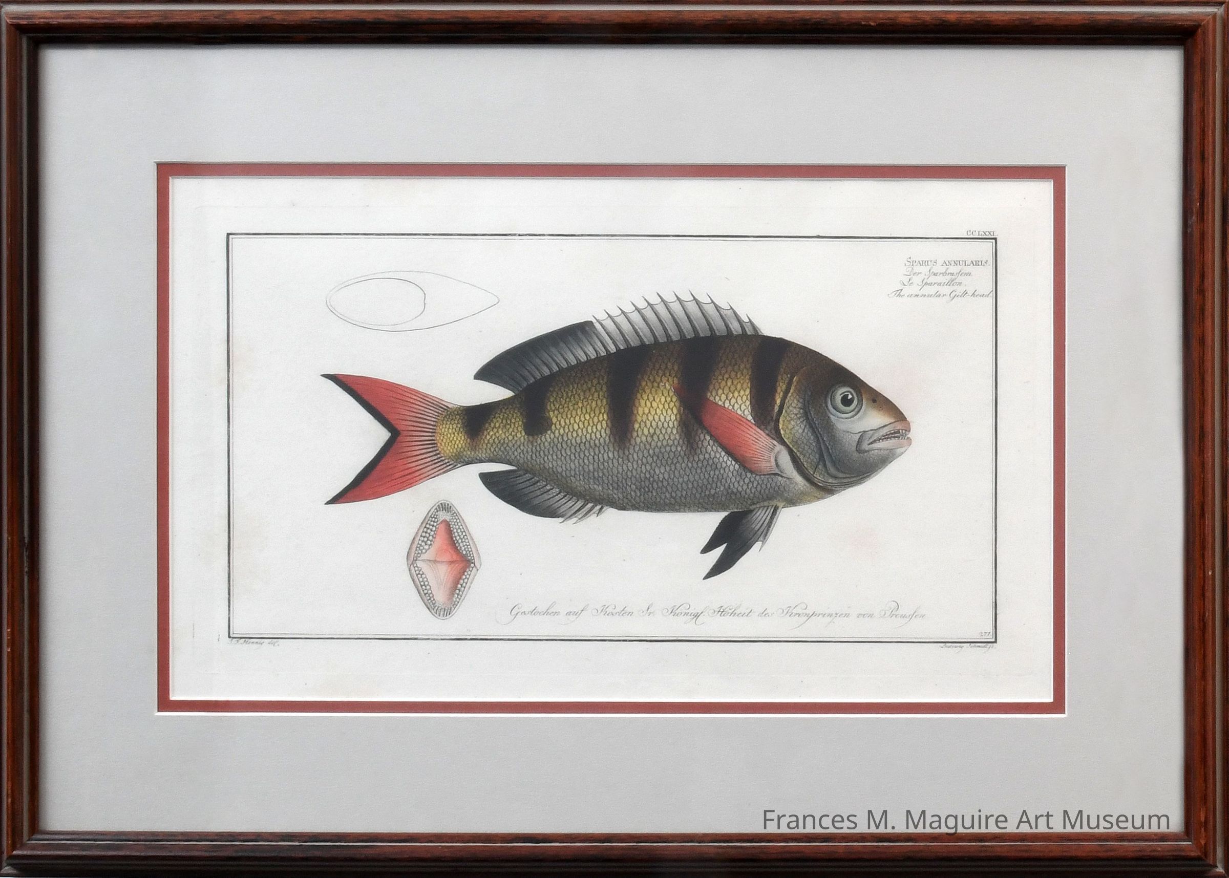 18th-c. hand-colored engraving of an annular gilt-head or annular seabream published in the book, Allgemeine Naturgeschichte der Fische (General Natural History of Fishes), written by Marcus Elieser Bloch.Made/Created