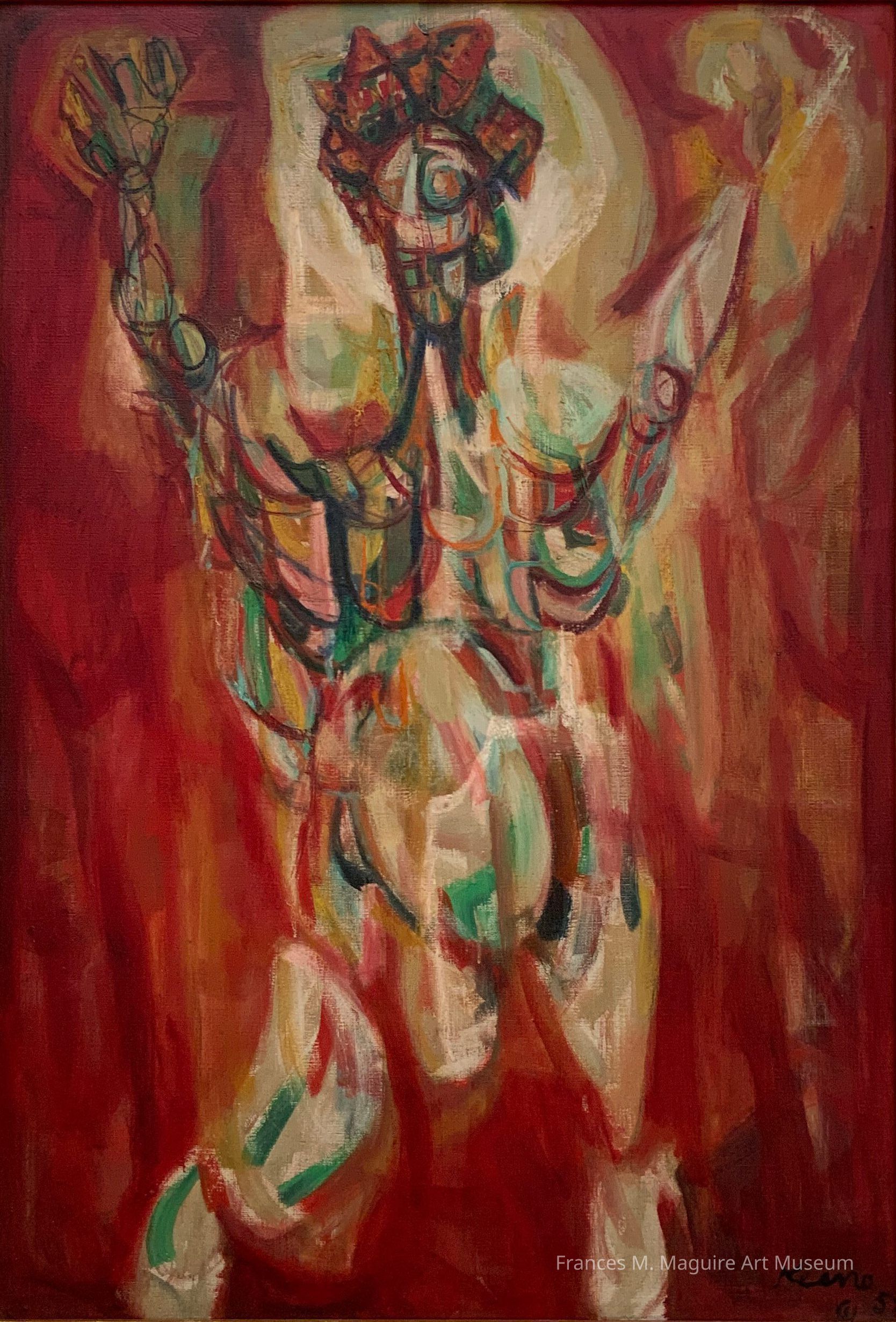 Self-described as an “abstract figurative painter,” Keene–a Philadelphia-based artist–used vivid color, expressive line, and geometric abstraction to convey personal experiences and concerns—especially those related to local African American communities. He painted The Blind King early in his career, and its subject and style demonstrates the impact of his sojourns to Paris and Haiti in the 1950s on his work. The crowned figure, whose identity is uncertain, aligns with the spiritual and mythological themes Keene explored during these years. Swirling, tightly clustered lines and saturated reds, greens, golds and oranges create drama and tension.