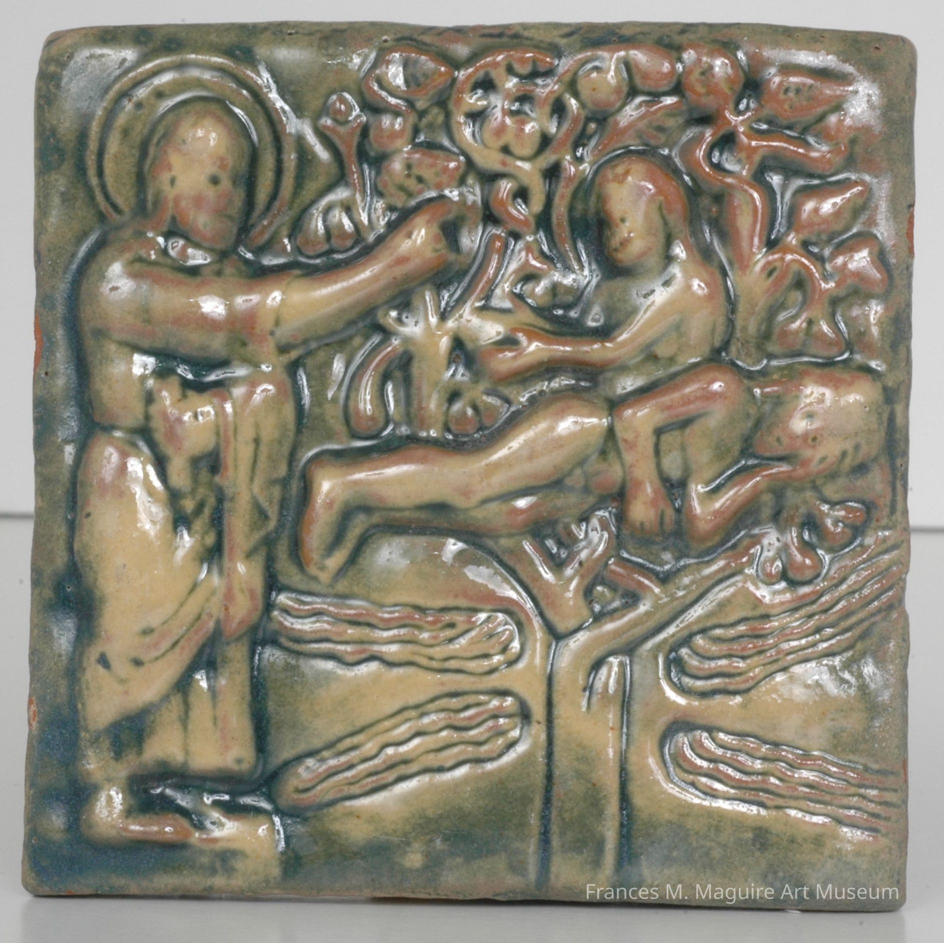 The image of the Creation of Eve (Gn. 2:21-22) shows God the Creator calling forth Eve from Adam's side as he sleeps in a fruit-bearing tree from which the Four Rivers of Paradise flow. This is one of Mercer's earliest tiles and was reproduced from a plaster cast of one of the Salerno Ivories, the largest unified series of ivory carvings preserved from the pre-Gothic Middle Ages and preserved in the Museo del Duomo at Salerno (Italy). Mercer obtained the cast of the Creation of Eve in 1900 from the Victoria and Albert Museum in London.Artwork Details