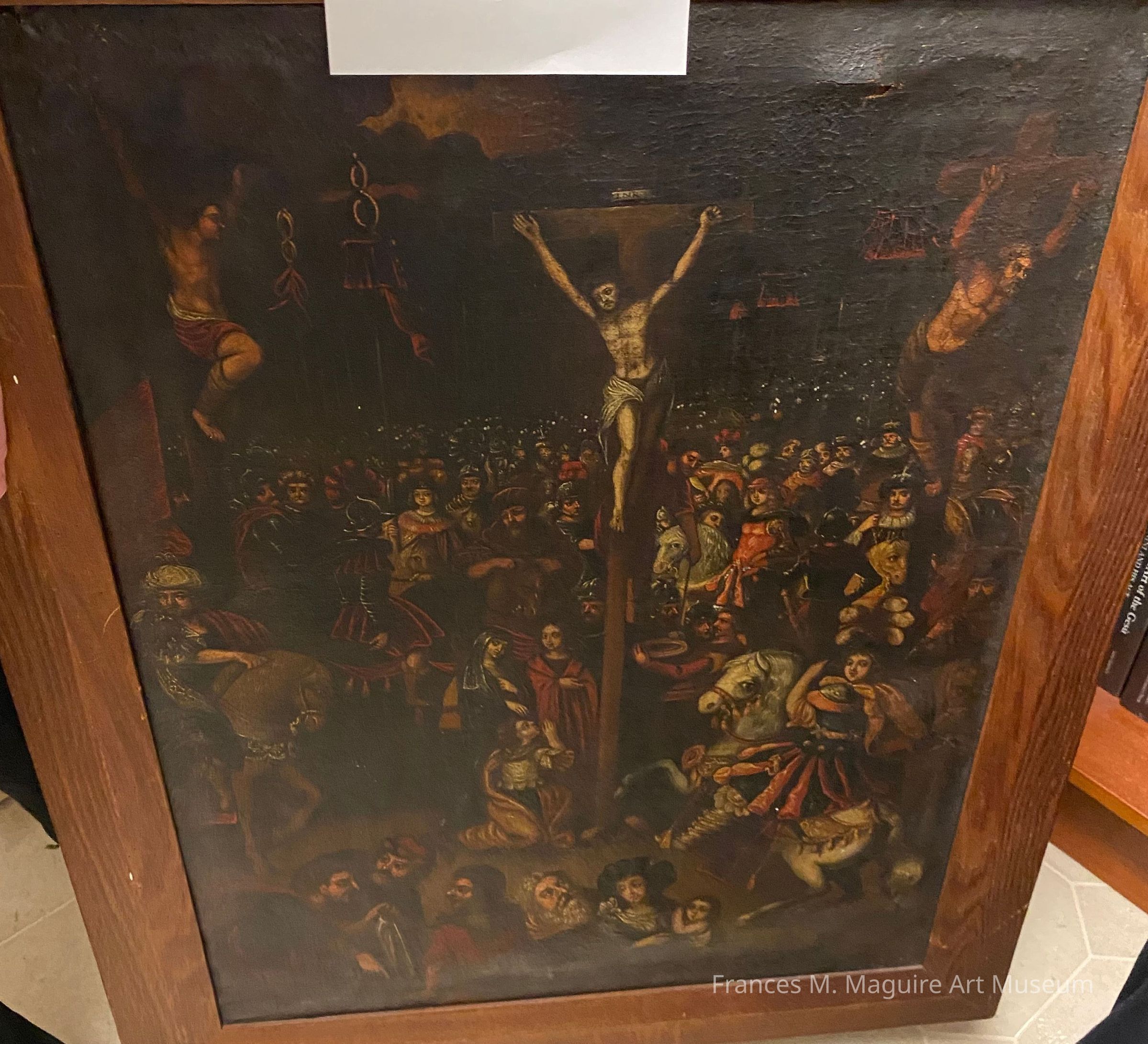 Oil painting of the crucifixion.