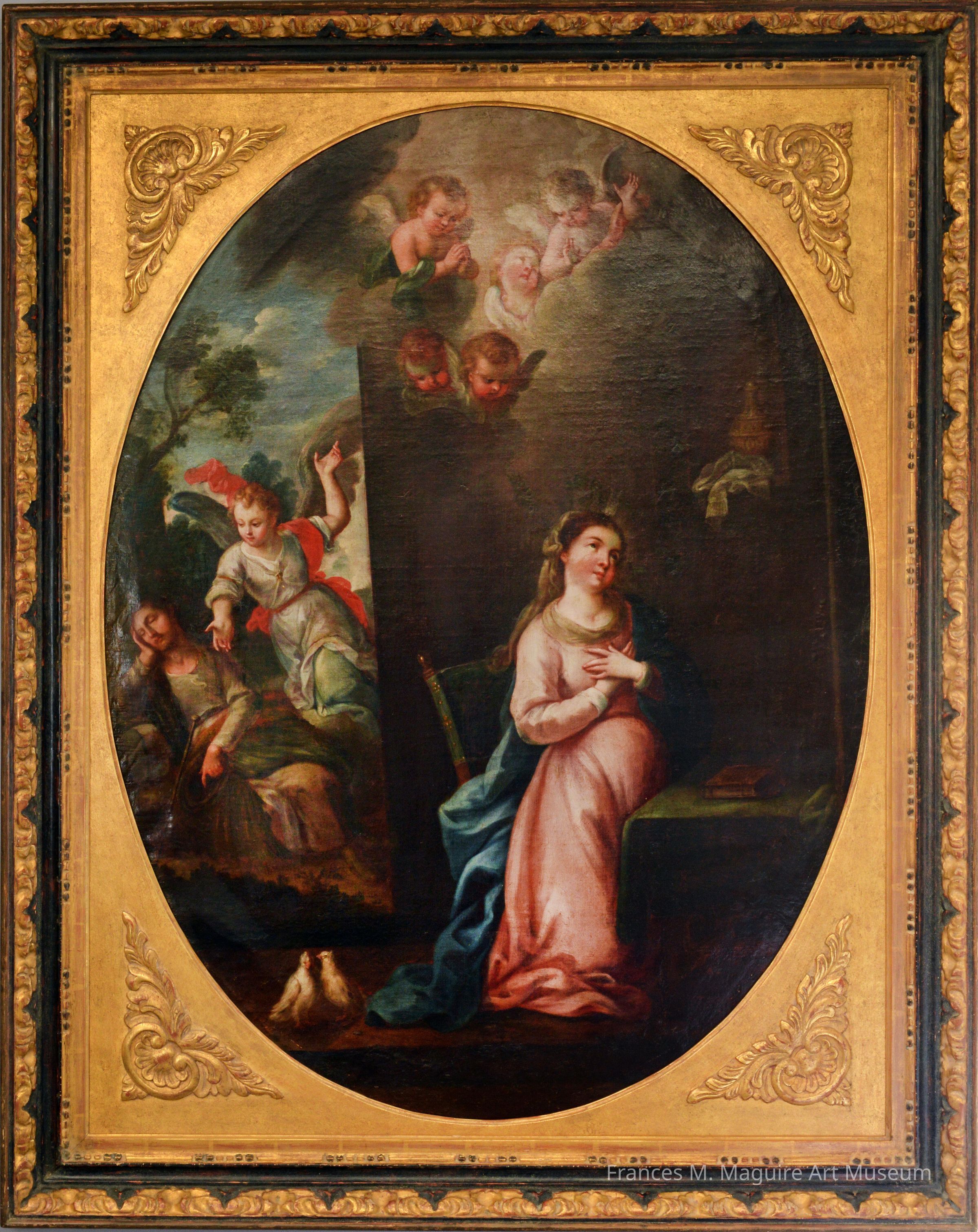 The portrayal of Joseph sleeping underscores his revered paternal role to the Holy Family and his divine knowledge. In this two-part composition, Joseph is depicted in a verdant landscape, while his wife Mary occupies an adjacent interior space. As Joseph dreams, the Archangel Gabriel tells him that Mary will bear the son of God. Mary is seated, arms crossed over her chest, gazing at a gold vessel, symbolic of her holy womb. Cherubs unify the disparate scenes, while the two turtle doves in the foreground represent Mary’s and Joseph’s humble sacrifice.