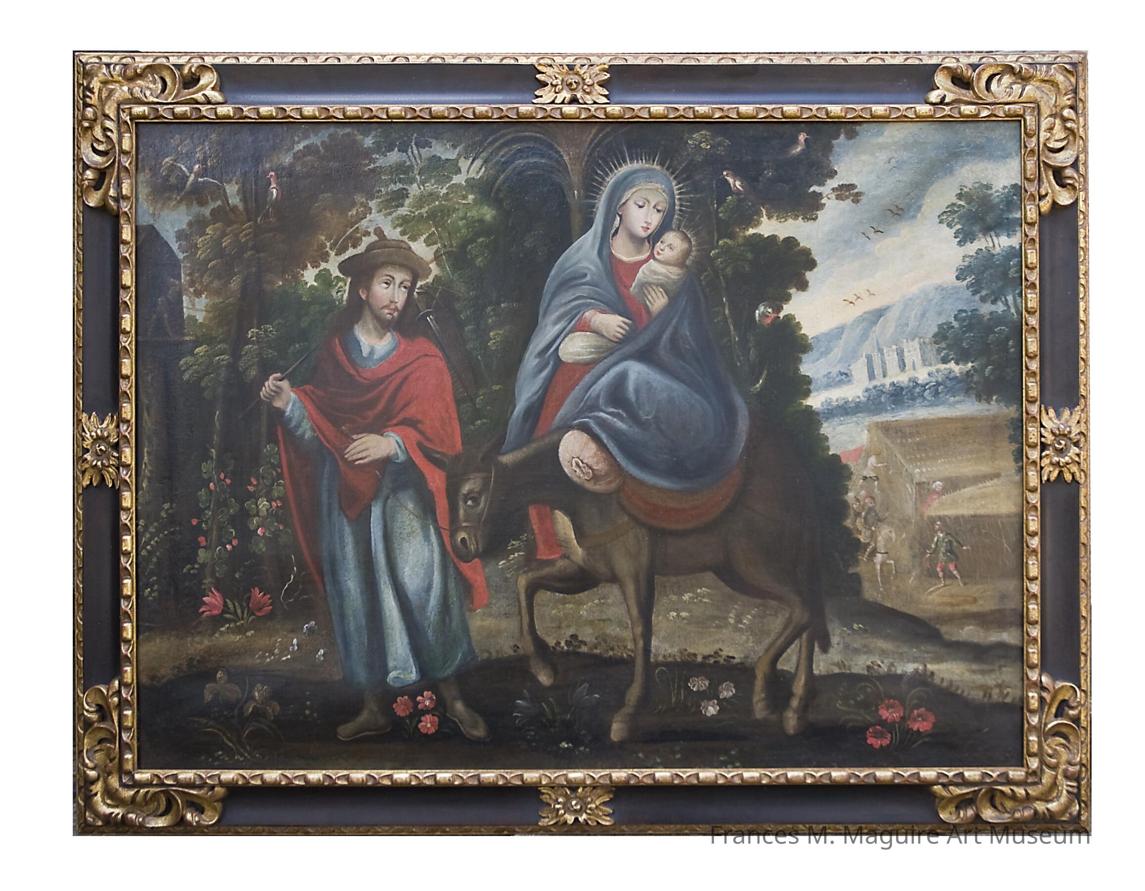 La huida a Egipto es una de las escenas de la vida de Jesús. Como ocurre con la pintura de la Natividad también expuesta en la sala, esta debe haber servido como herramienta didáctica para educar a la población local con respecto a la vida de Jesús y sus orígenes. Según el Evangelio de Mateo, luego de la adoración de los Reyes, un ángel se le apareció a José indicándole la necesidad de huir a Egipto para escapar de Herodes. Las figuras – unas vistiendo los tradicionales colores rojo y azul, y otras con halos – marchan en medio de un verde paisaje decorado con flora y fauna nativa. Al fondo, un grupo de soldados de Herodes busca a la Sagrada Familia.
