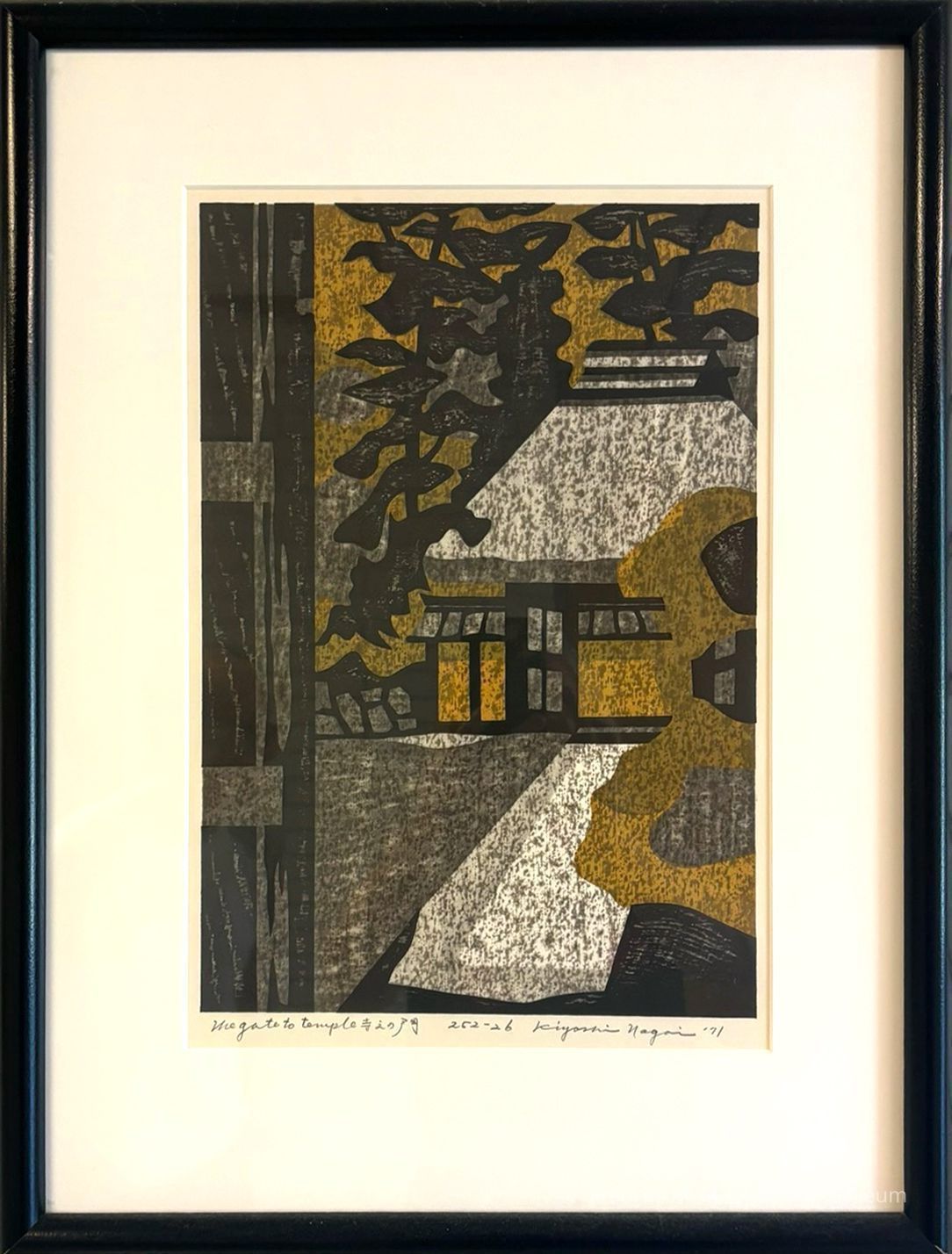 To avoid ruining his reputation as a boundary-pushing abstract artist, Tajima used the pseudonym “Nagai Kiyoshi” to sell his commercial prints, which were popular with tourists and American soldiers stationed in Japan after WWII. Westerners were drawn to the vibrant colors and shapes inspired by European avant-garde movements like Abstract Expressionism. The prints often depicted traditional Japanese landscapes or motifs, such as the Buddhist temple in this piece. It is unknown if the pictured temple was inspired by a real location, further suggesting that foreigners were the target audience. Like most of the other twentieth-century artists in this exhibition, Tajima was involved in the sōsaku hanga (creative print) movement. Unlike the traditional division of labor between designer, woodblock carver, printer, and publisher, these artists handled all aspects of the production of the woodblock print by themselves.Label Type