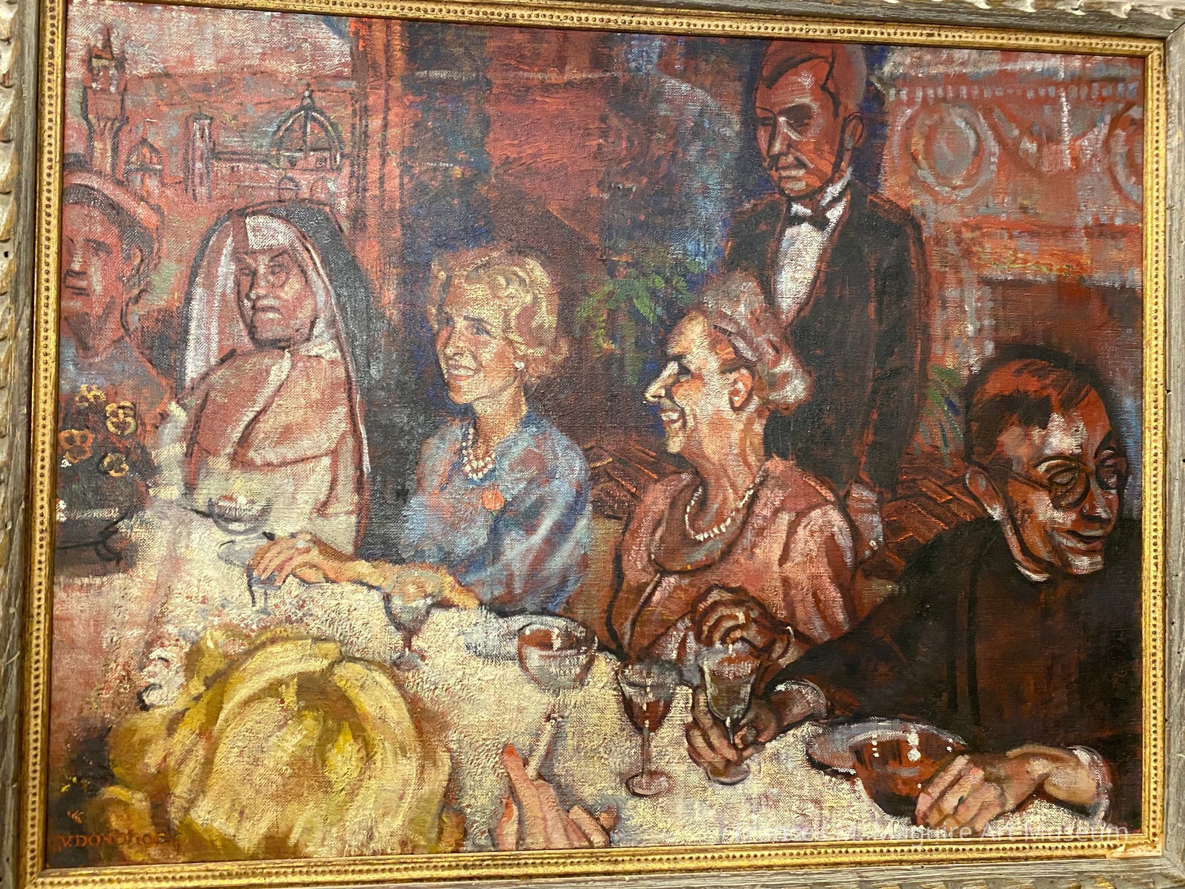 20th-c. oil painting of a dinner party consisting of Ambassador Clare Boothe Luce; Sister Mary Eunice, O.P.; a member of the Catholic University Drama Department; Rev. Jean Danielou, S.J.; Dino (the butler); and a friend of Amb. Luce. The city of Florence can also be seen in the upper left corner of the painting.Made/Created