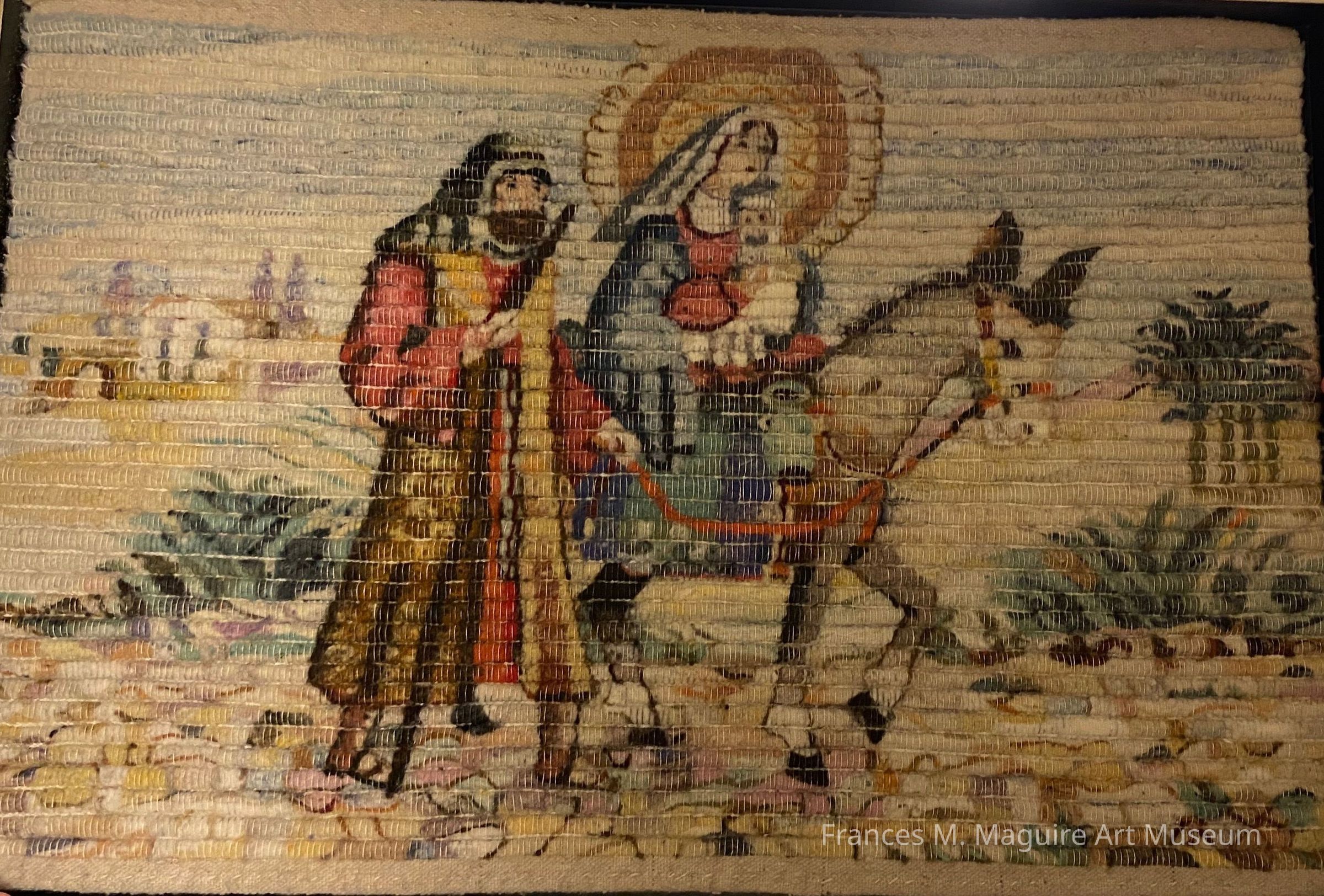Framed textile wall hanging of the Holy Family's flight into Egypt. This piece was likely handwoven with wool yarn.Interpretative Labels