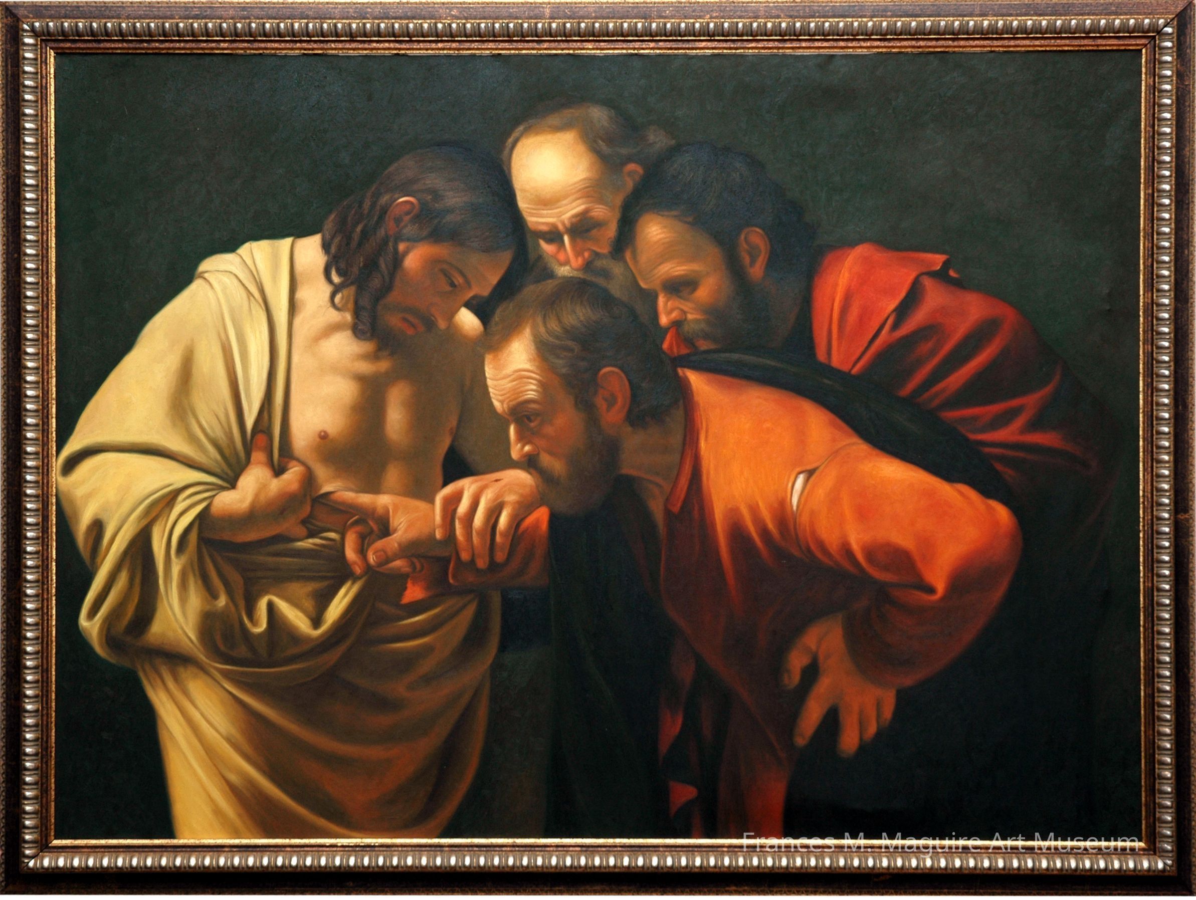 20th-c. reproduction of Caravaggio's painting of "Doubting Thomas" touching Jesus' wounds.Made/Created