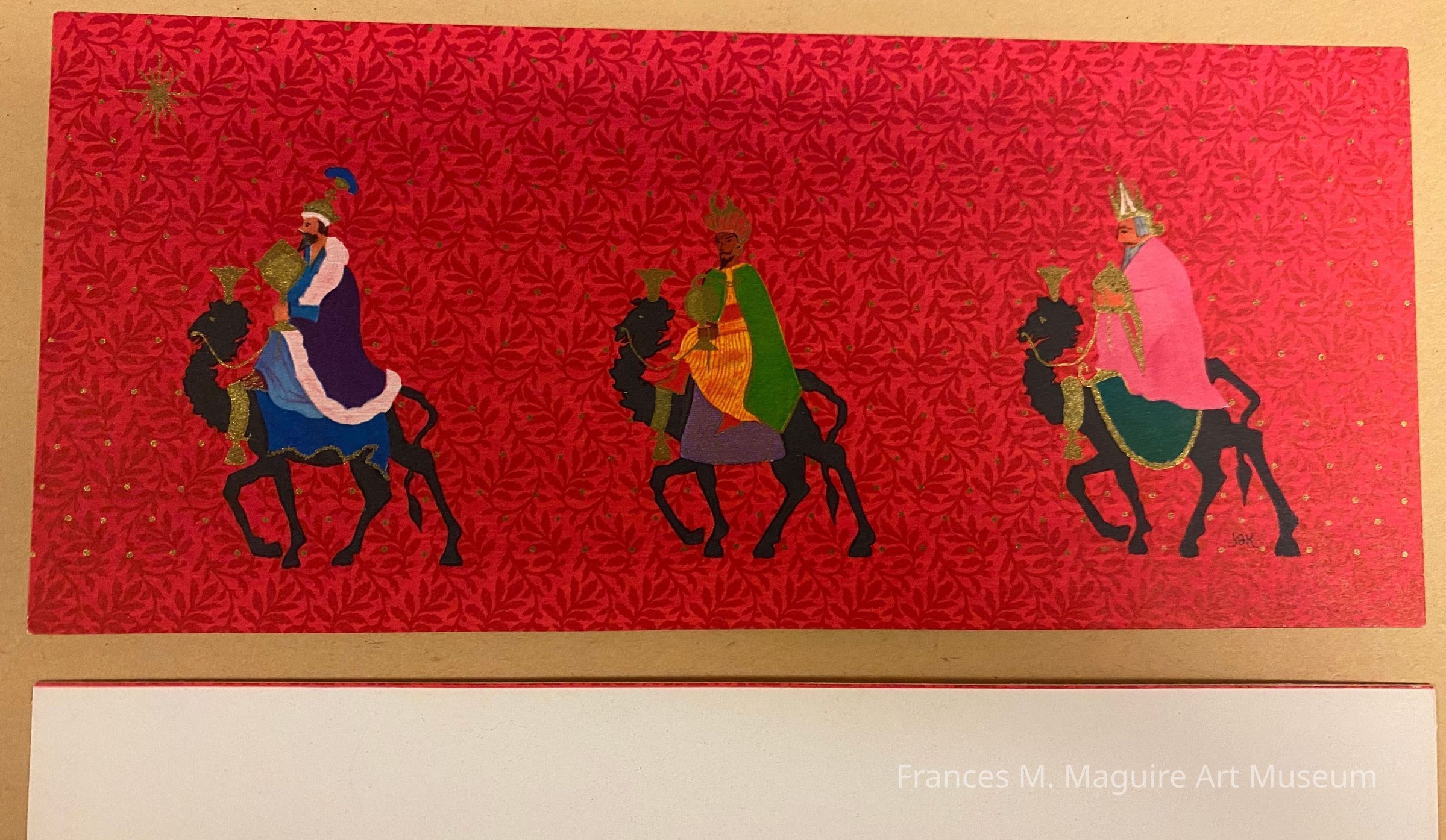 Hallmark Christmas Card featuring a reproduction of First Lady Jackie Kennedy's painting "The Journey of the Magi." The card was released in 1963, and the proceeds benefitted the National Cultural Center in Washington, D.C., which was later named the John F. Kennedy Memorial Center for the Performing Arts (or Kennedy Center).Made/Created