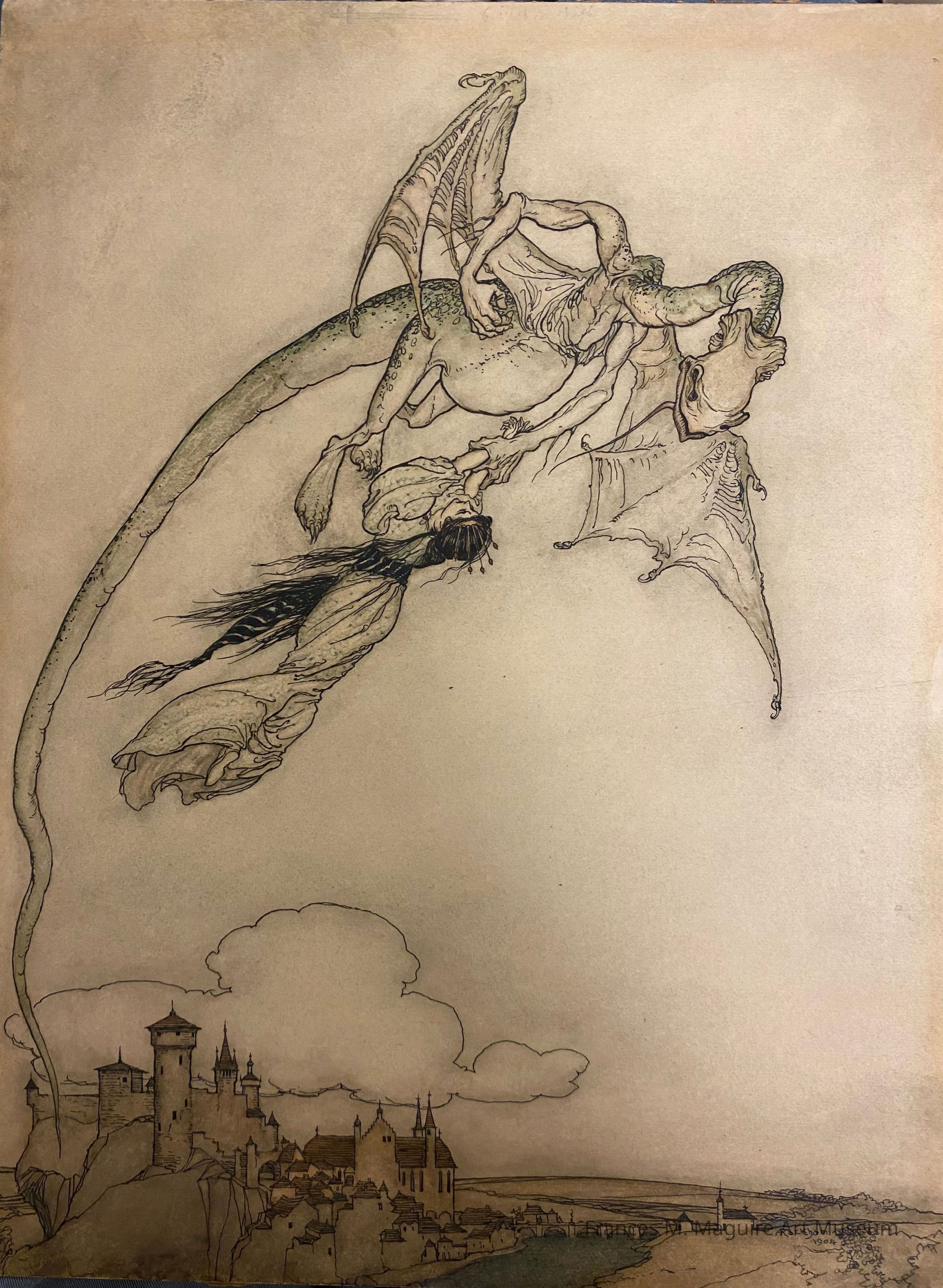 Early-20th-c. watercolor and ink illustration of a scene in the fairy tale "The Four Clever Brothers," which was published in the 1909 edition of "The Fairy Tales of the Brothers Grimm," translated by Alice Lucas and illustrated by Arthur Rackham.Artwork Details