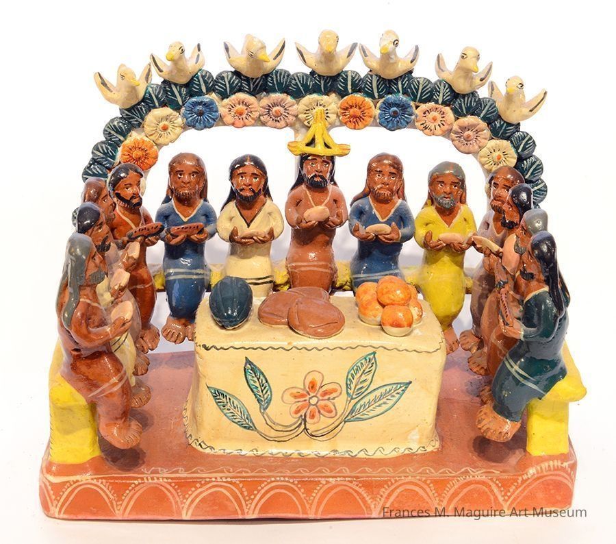 20th-c. Mexican folk art sculpture depicting The Last Supper with 13 figures seated around a table.