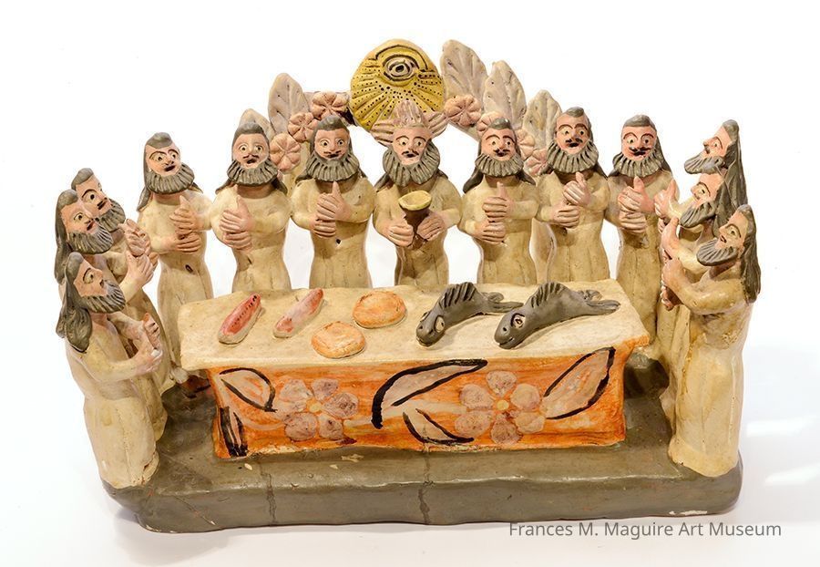 20th-c. Mexican folk art sculpture depicting The Last Supper with 13 bearded figures standing around a table.Interpretative Labels