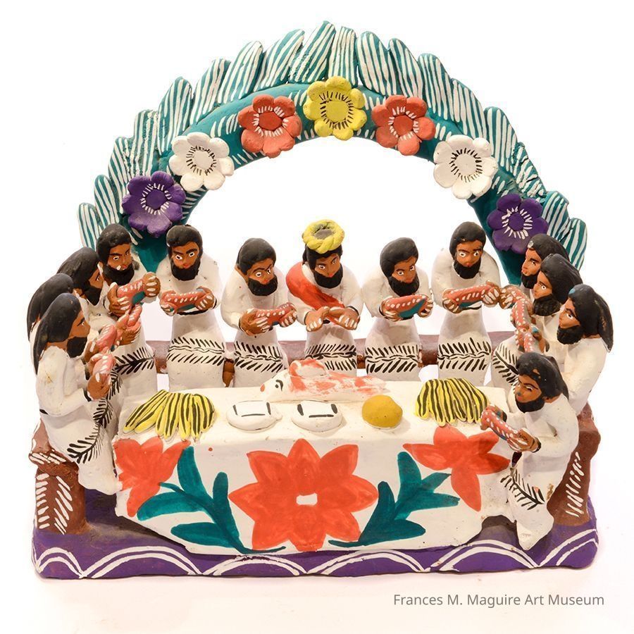20th-c. Mexican folk art sculpture depicting The Last Supper with 13 bearded figures seated around a table.Dimensions