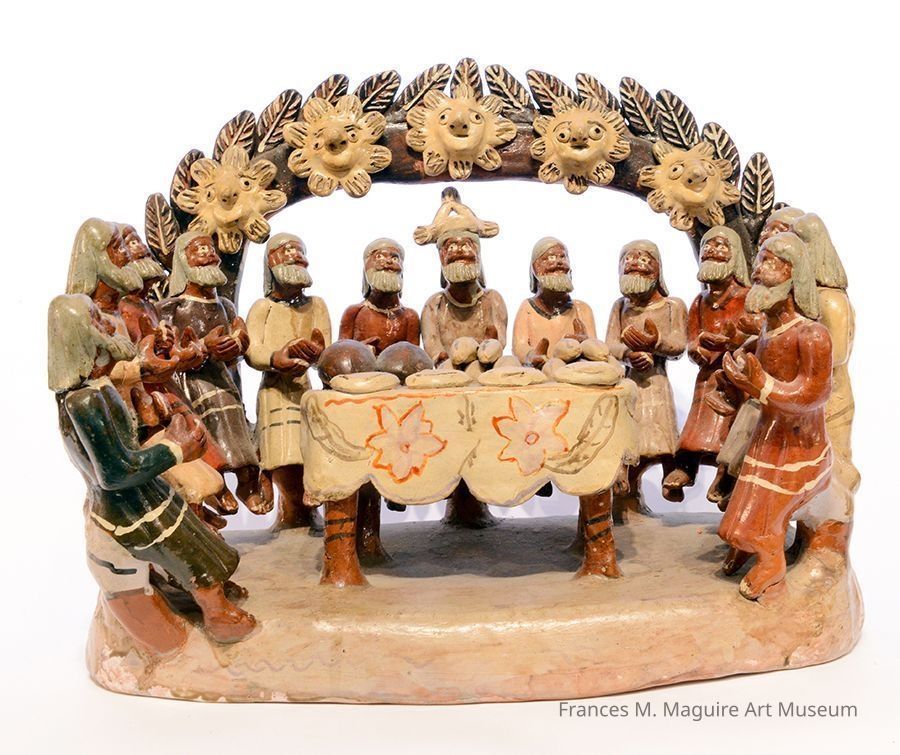 20th-c. Mexican folk art sculpture depicting The Last Supper with 13 bearded figures seated around a table.Dimensions