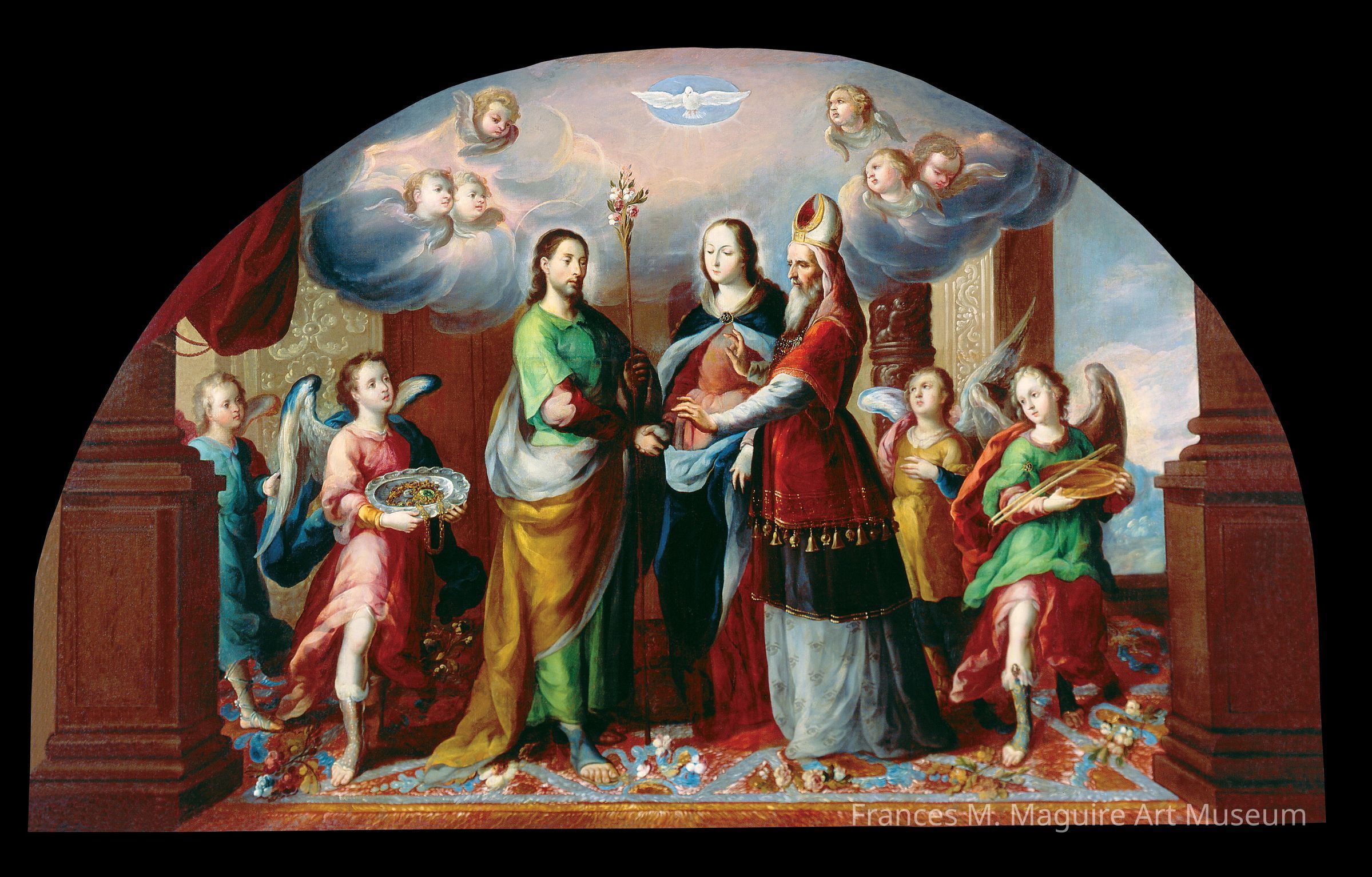 This large, lunette-shaped painting was part of a series originally located in the former Jesuit College of St. Francis Xavier in Tepotzotlán, Mexico. It celebrates the holy marriage of Joseph and Mary, a popular subject throughout colonial Spanish America, where missionaries promoted Christian marital and family values to Indigenous populations. Surrounded by cherubs and angels dressed in jewel-like colors, a youthful Joseph and radiant Mary join their hands as the high priest blesses their union. According to Jacobus de Voragine’s Golden Legend (ca. 1260), God demonstrated his choice of Joseph as Mary’s husband when his rod blossomed and a dove descended. Both the flowering rod and the dove can be seen here prominently along the central axis of the composition.