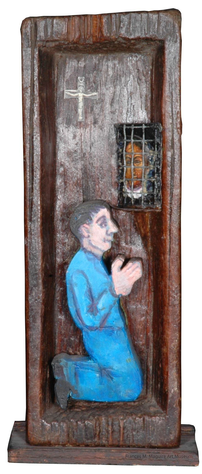 20th-c. mixed media box construction with a penitent man kneeling and a priest behind a wire screen.Made/Created