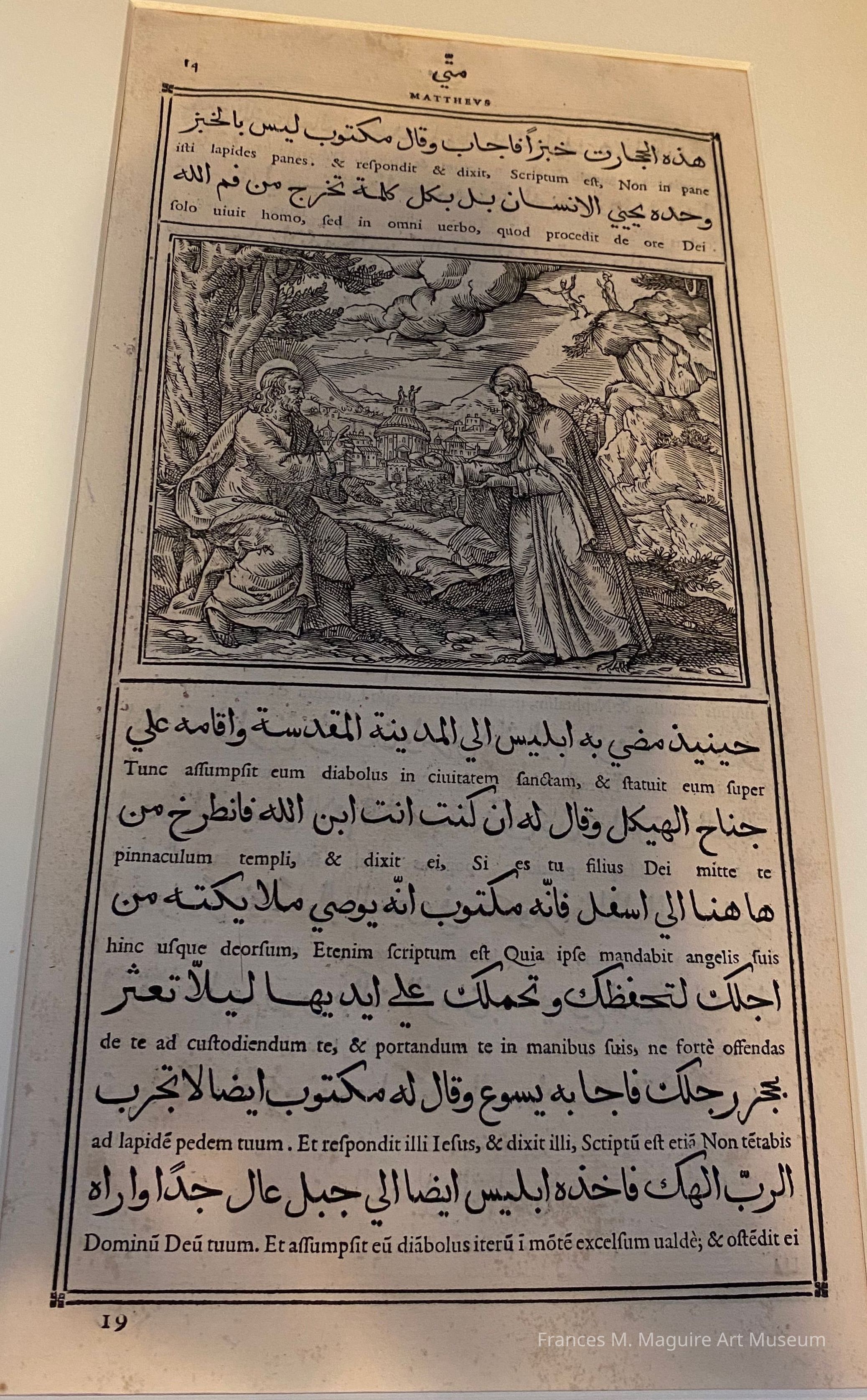 16th-c. engraved print of the Temptation of Jesus from Evangelium Sanctum Domini, a gospel book in Arabic and Latin.