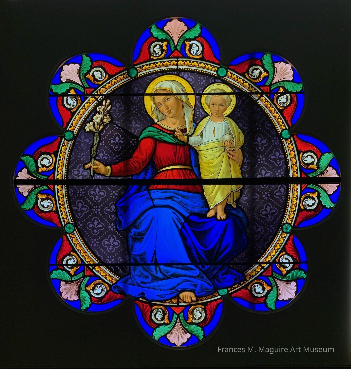 Octofoil stained-glass of the Madonna and Christ child.Made/Created