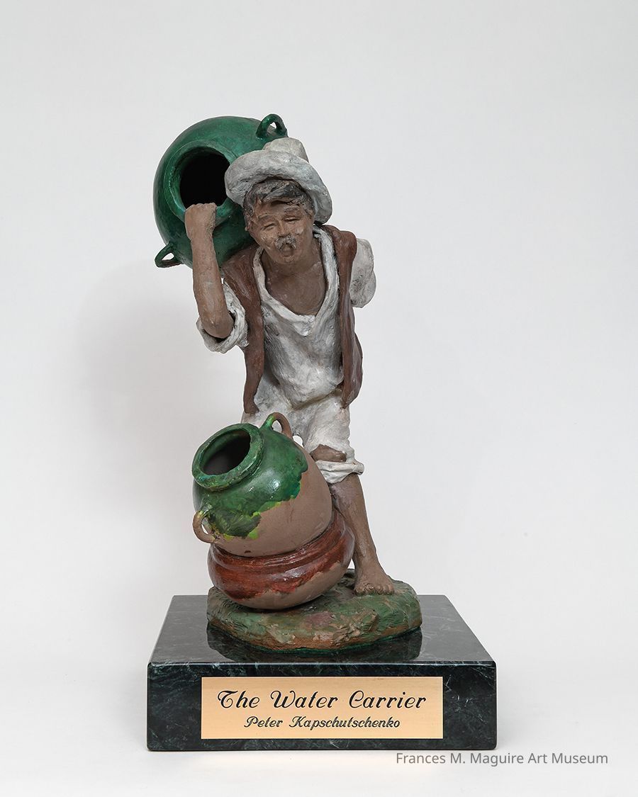Polychromed terracotta sculpture of a man carrying a large jug of water.