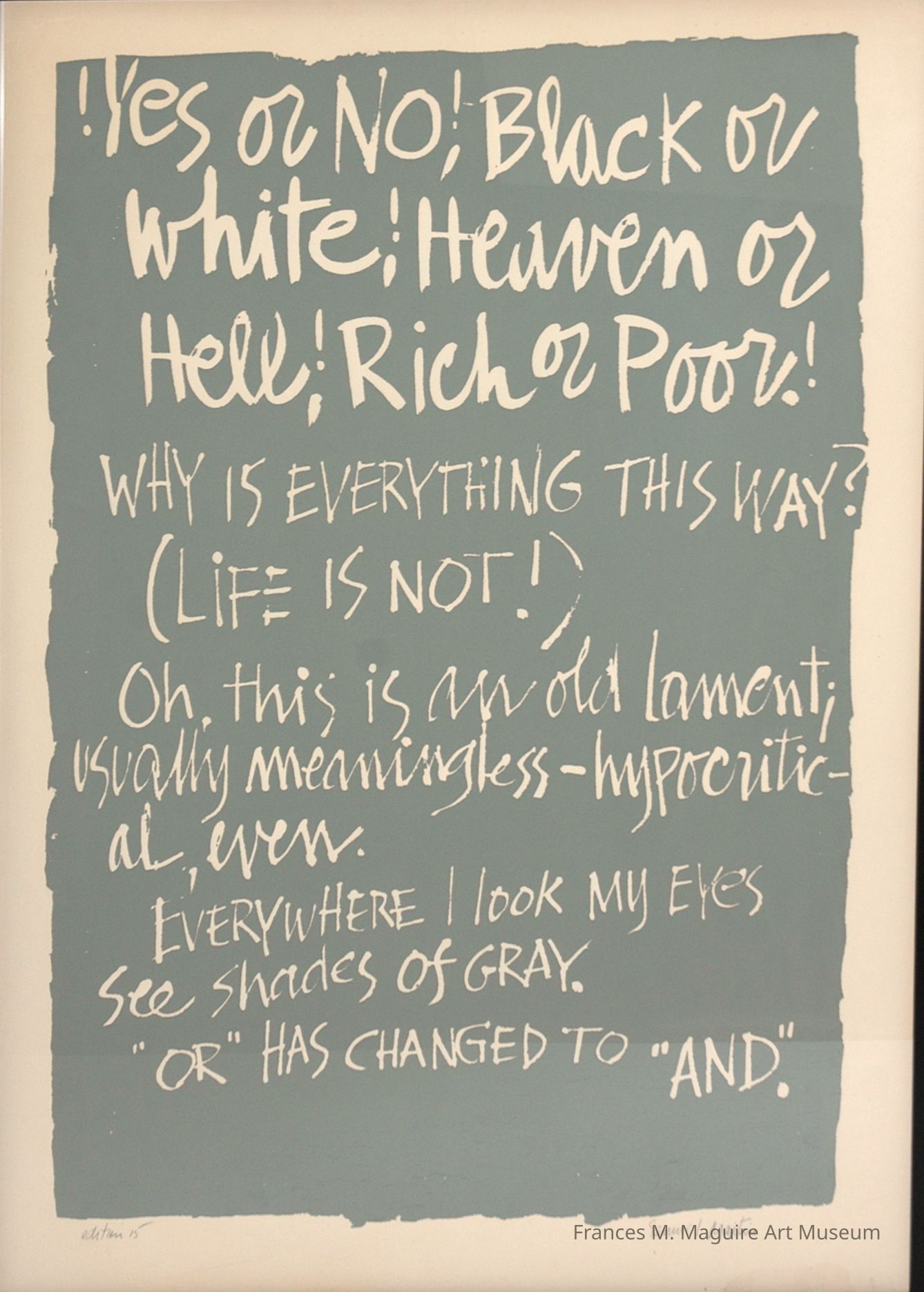 Title page for a series of 15 color serigraph prints. The title page reads, "Yes or no! Black or white! Heaven or hell! Rich or poor! Why is everything this way? (Life is not!) Oh, this is an old lament; usually meaningless–hypocritical, even. Everywhere I look my eyes see shades of gray. ‘Or’ has changed to ‘and.’”Artwork Details