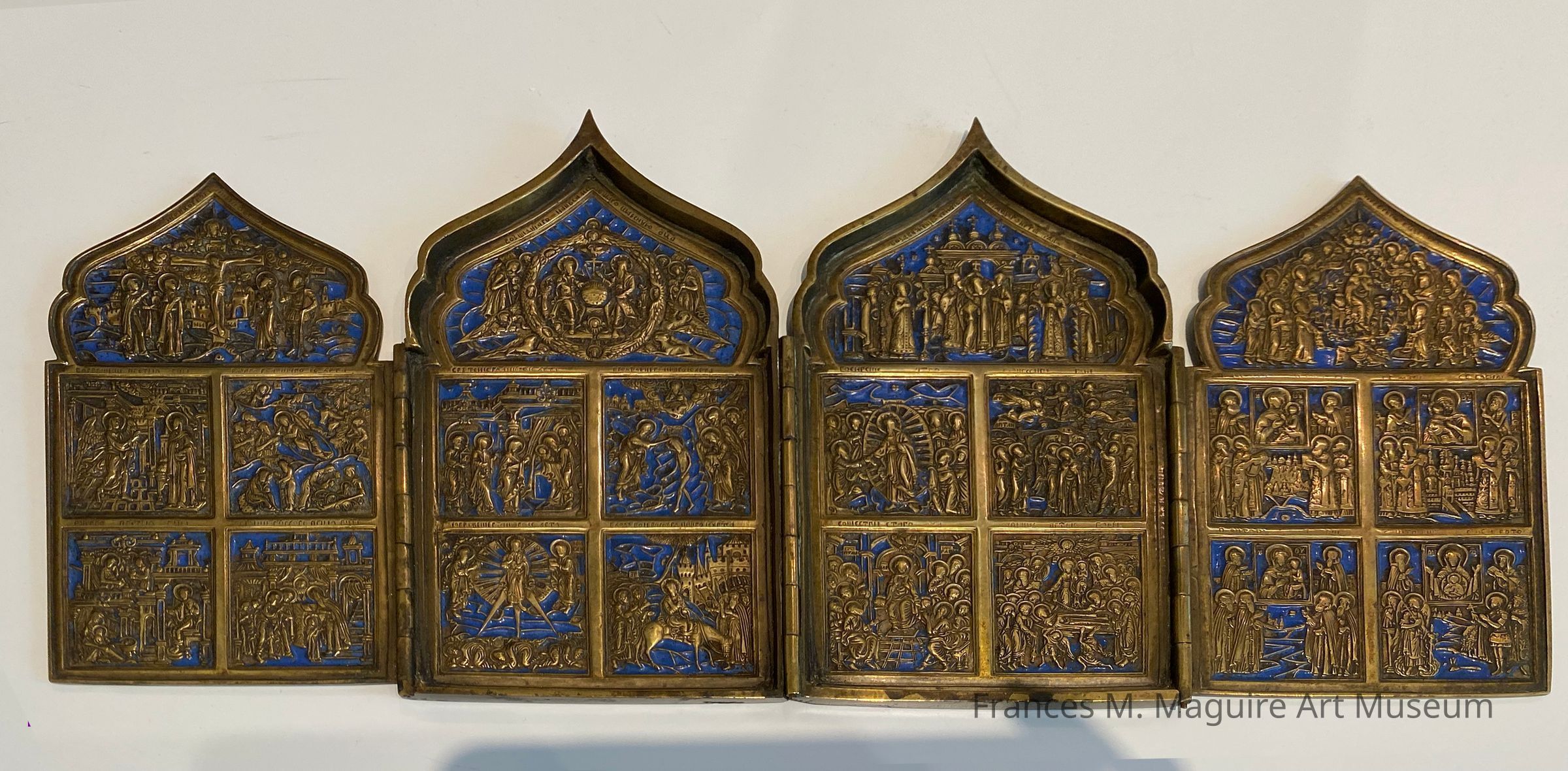 Each leaf is a rectangle divided into quadrants and surmounted with a raised, ogee-arch crest. Attached by piano hinges, leaves close over one another from both ends. The outer back or cover of the icon celebrates the Feast of the Exaltation of the Holy and Life-Giving Cross in image and text. Each of the twenty reserves contains numerous figures, usually in a landscape.