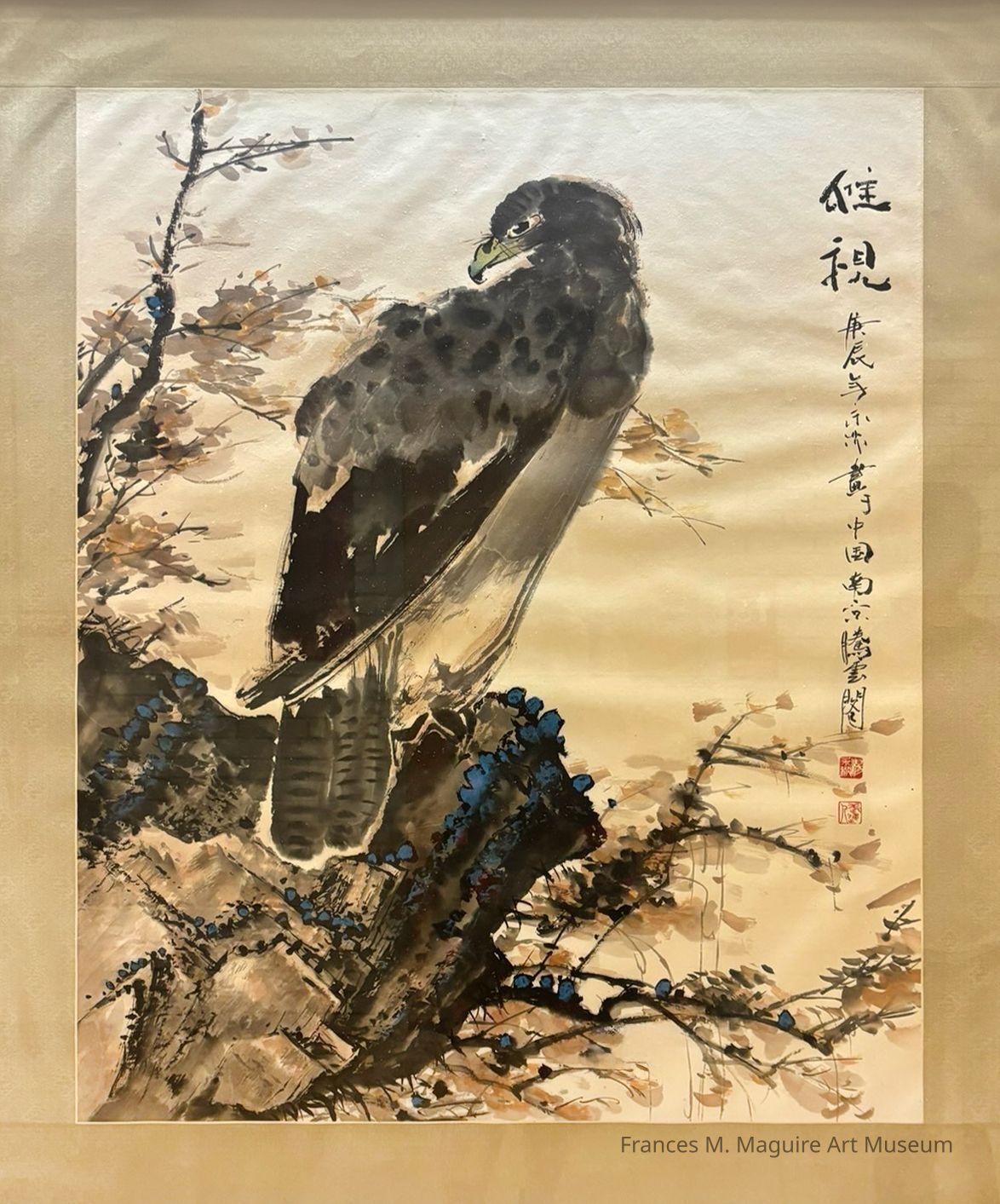 Ink brush painting on rice paper of a hawk perched on a rock.