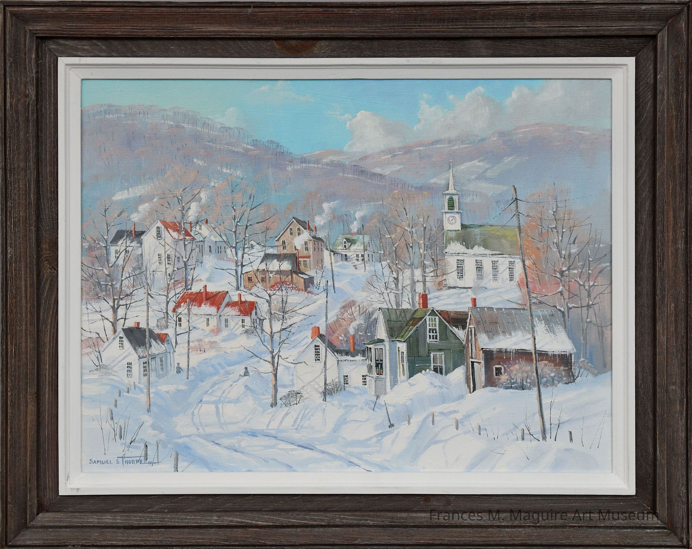 Oil-on-canvas landscape painting of a snowy New England village.Made/Created