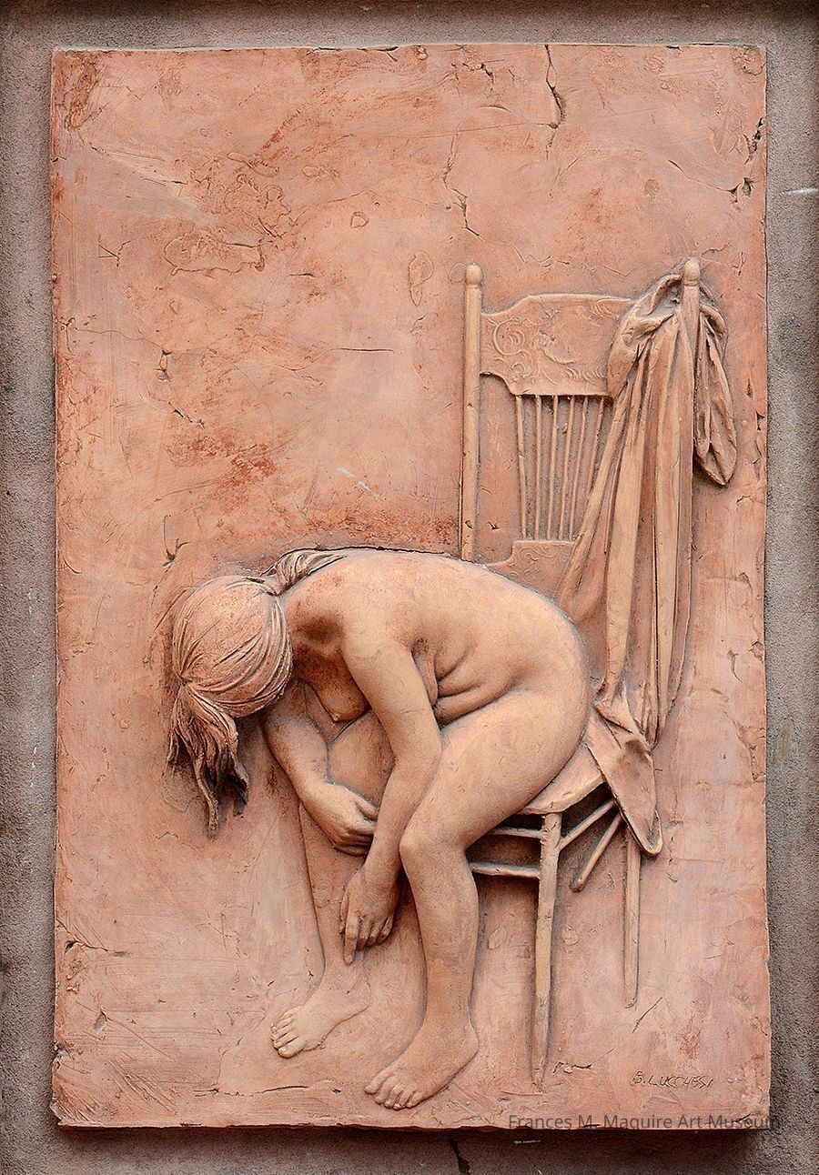 Plaster relief image of a nude woman seated on a chairMade/Created